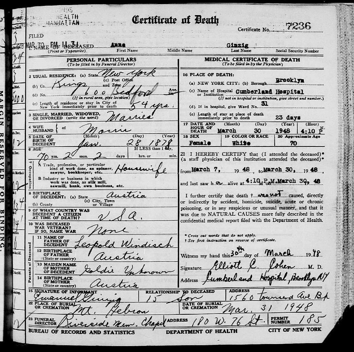 Died: March 30, 1948 in Cumberland Hospital, Brooklyn, Kings County, New York.