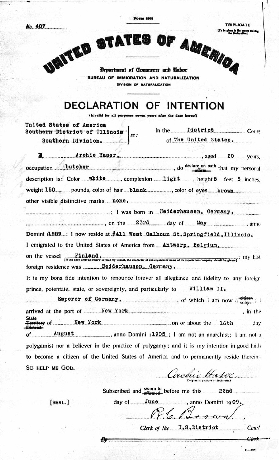 Declaration of Intention - June 22, 1909 - Southern District of Illnois County, Springfield, Sangamon County, Illinois.