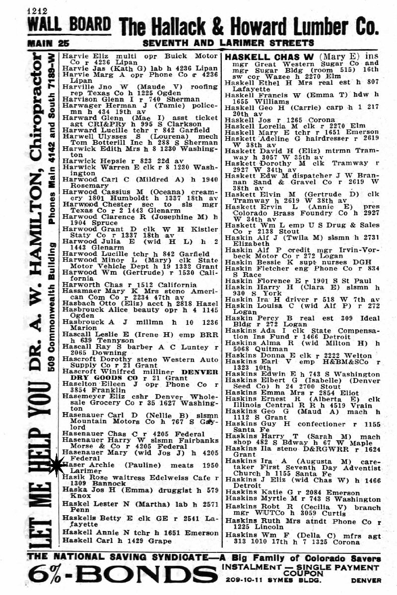 1923 - Grocer (address 1950 Larimer, Denver, Denver County, Colorado).