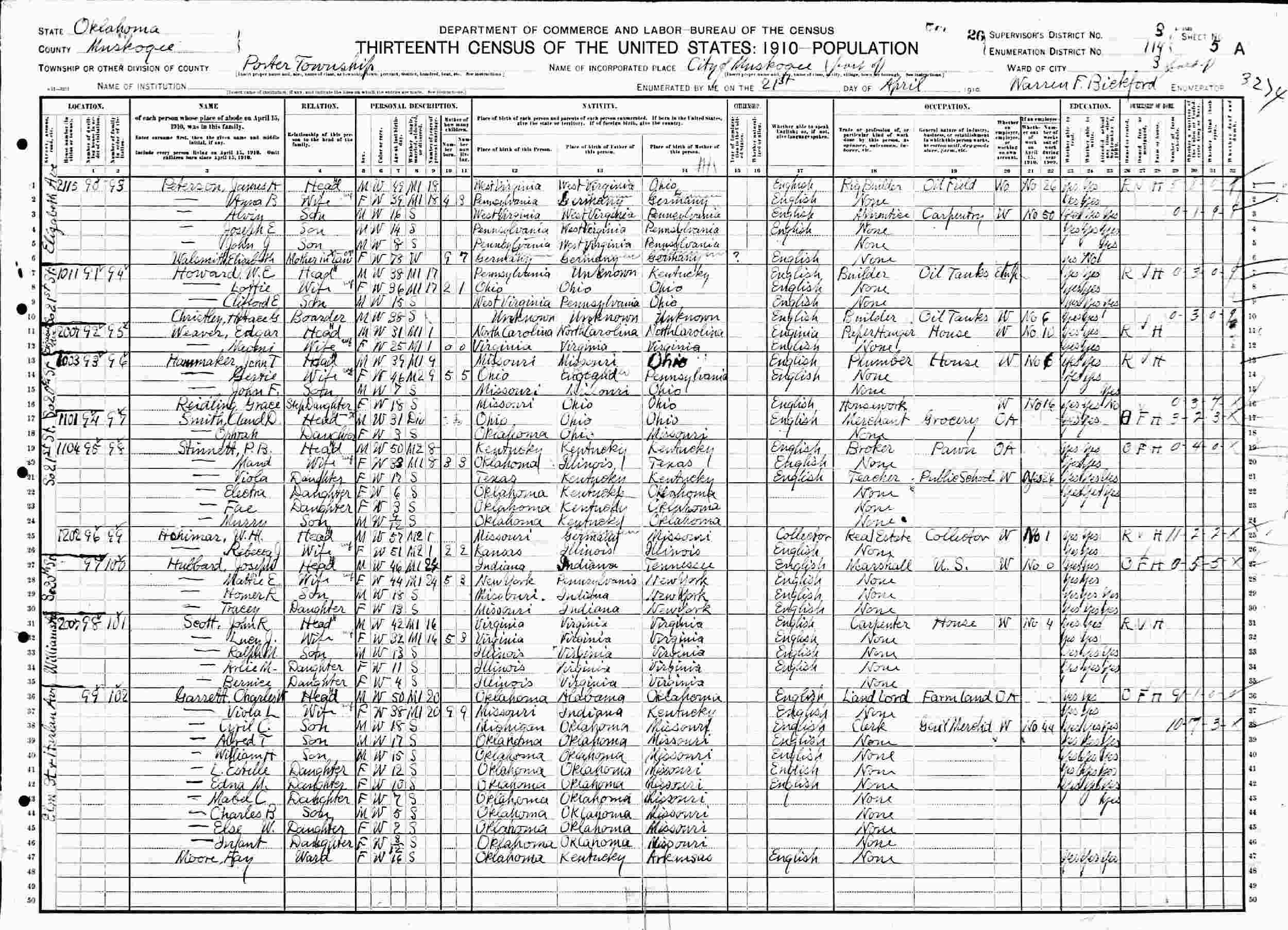 April 21, 1910 - 2007 Williams Street, Supervisor's District 3, Enumeration District 114, Ward 3, Porter Township, Moskogee, Muskogee County, Oklahoma.