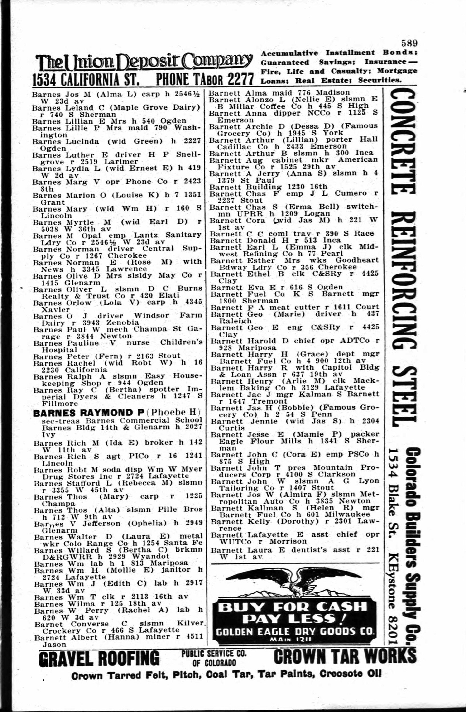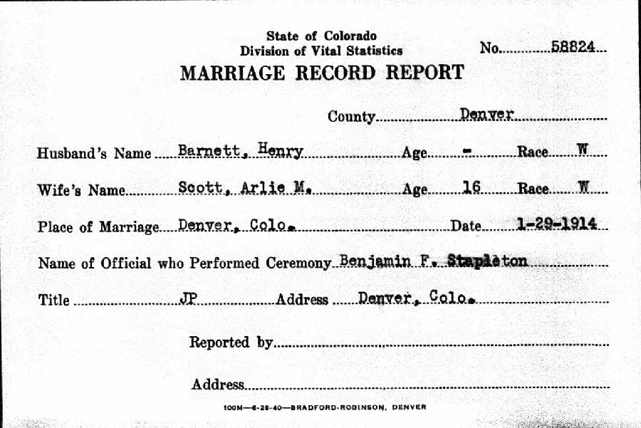 Married: (1) Henry Barnett January 29, 1914 in Denver, Denver County, Colorado. (Divorce: April 14, 1934 in Denver, Denver County, Colorado.)