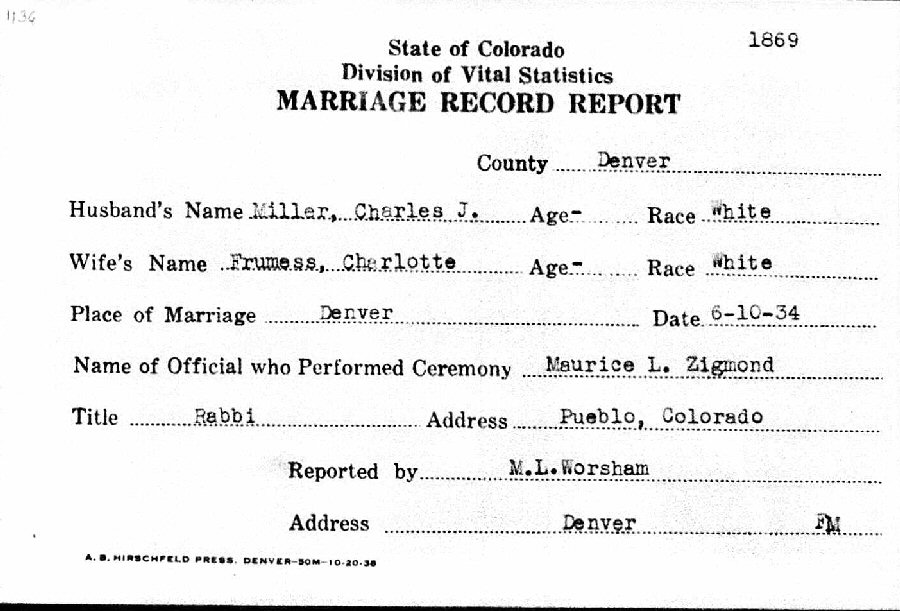 Married: Charlotte Frumess June 10, 1934 in Denver, Denver County, Colorado.