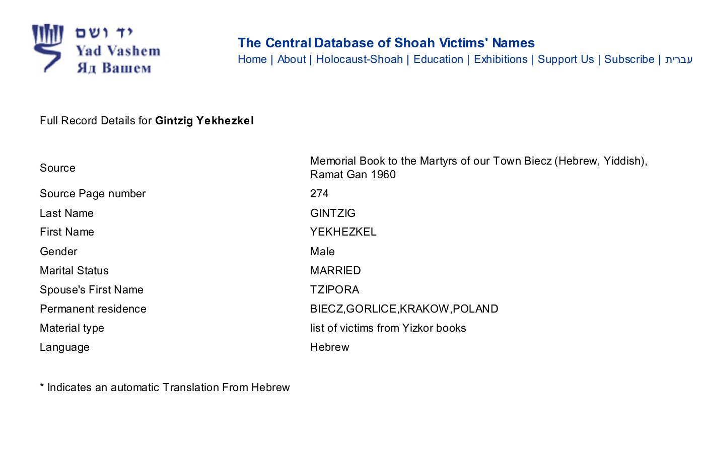 Died: Belzec Concentration Camp, Biecz, Poland (Shoah).