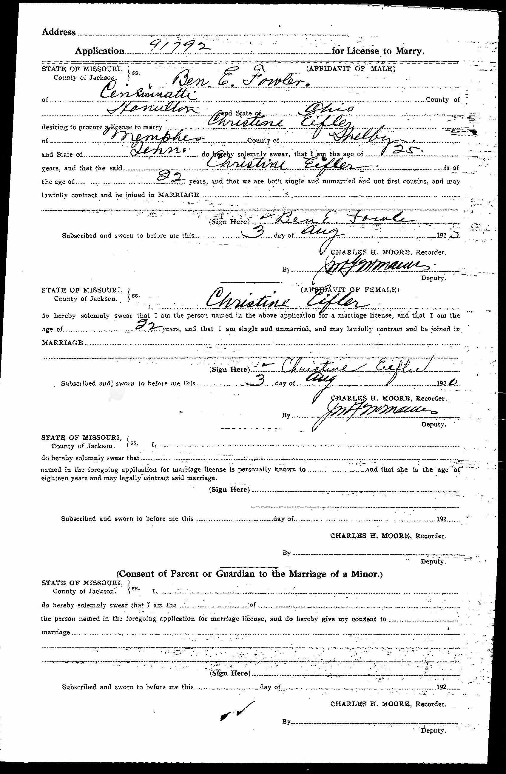Married: (1) Ben Earhart Fowler August 3, 1920 in Jackson, Missouri and March 6, 1924 in Hendricks County, Indiana.