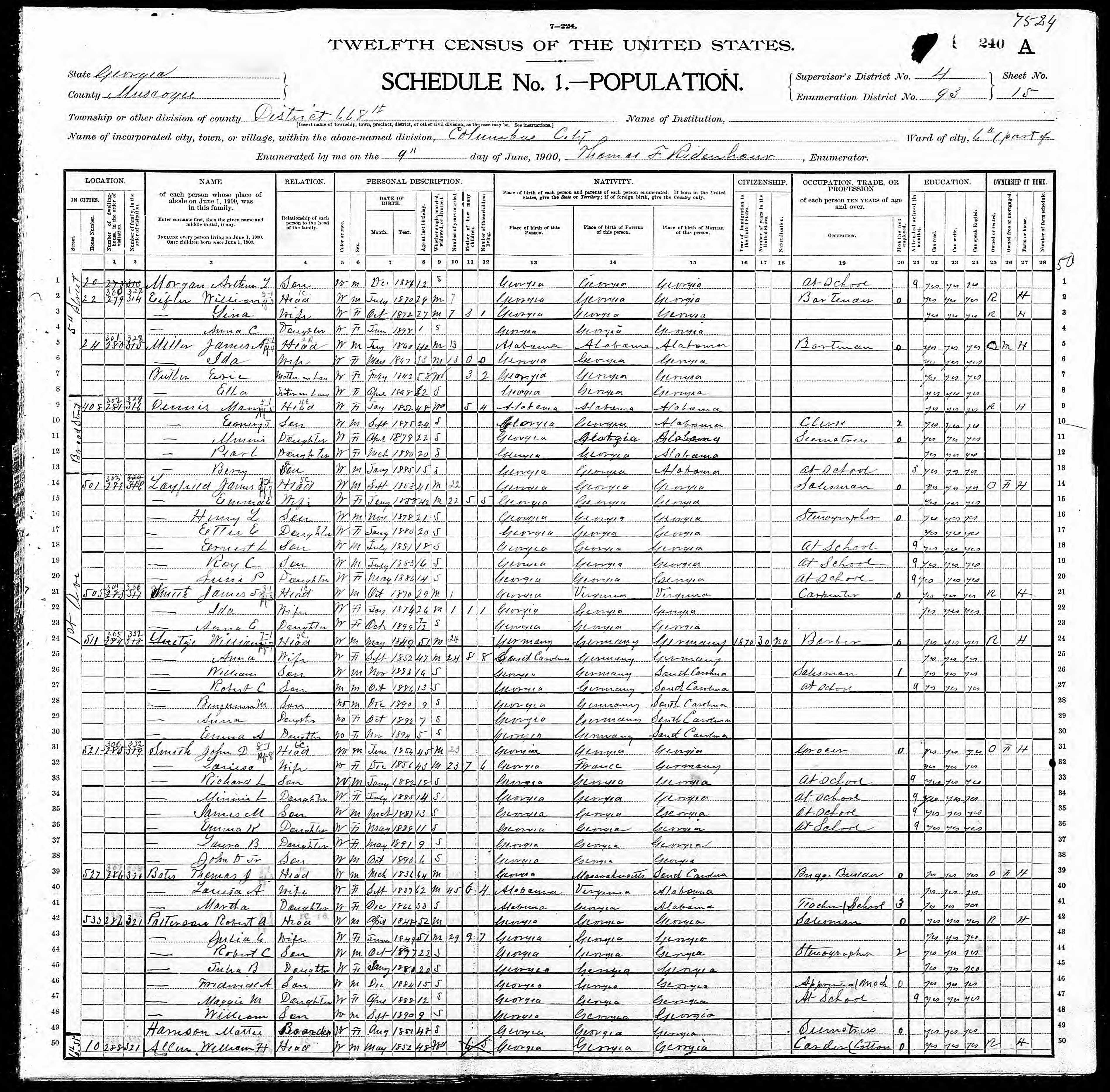 June 9, 1900 - 22 5th Street, Supervisor's District 4, Enumeration District 93, Ward 6, District 668, Columbus, Muscogee County, Georgia.