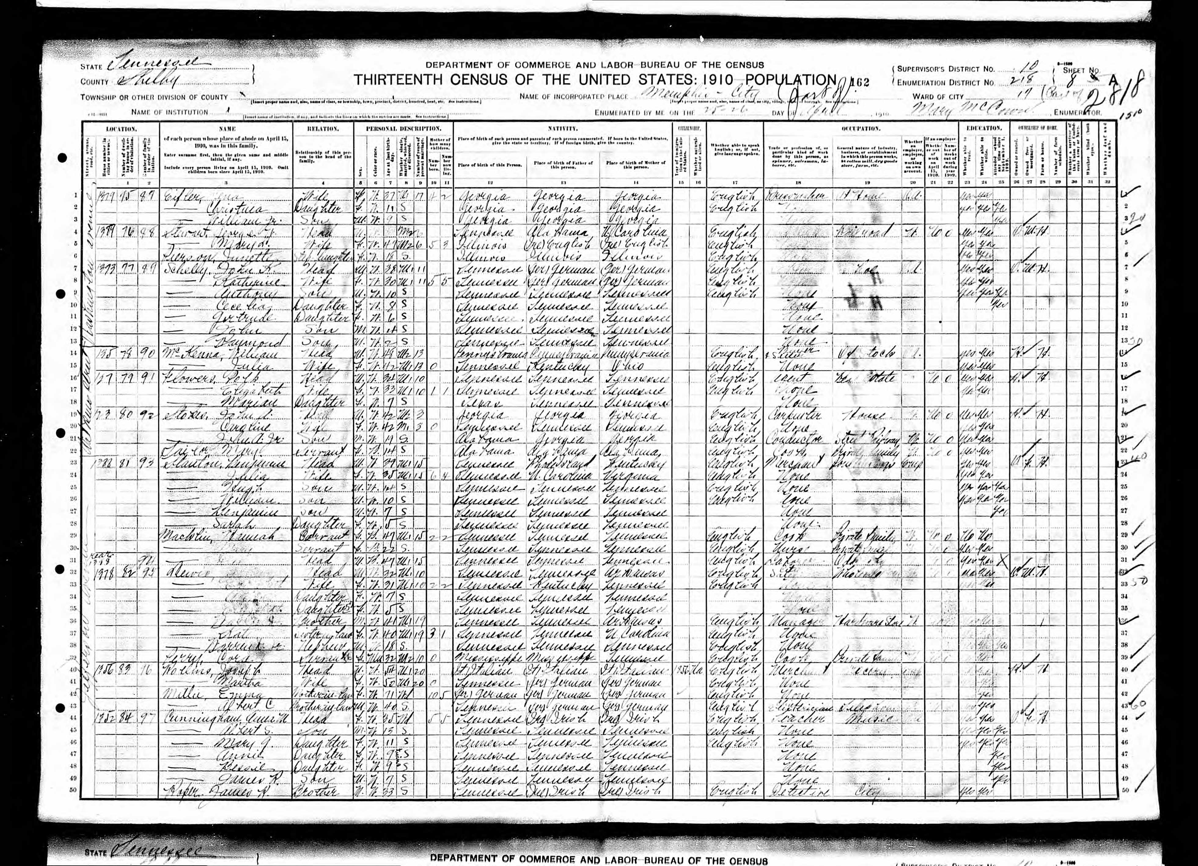 April 25-26, 1910 - 1379 Haugton Avenue, Supervisor's District 10, Enumeration District 218, Ward 17, Memphis,Shelby County, Tennessee.