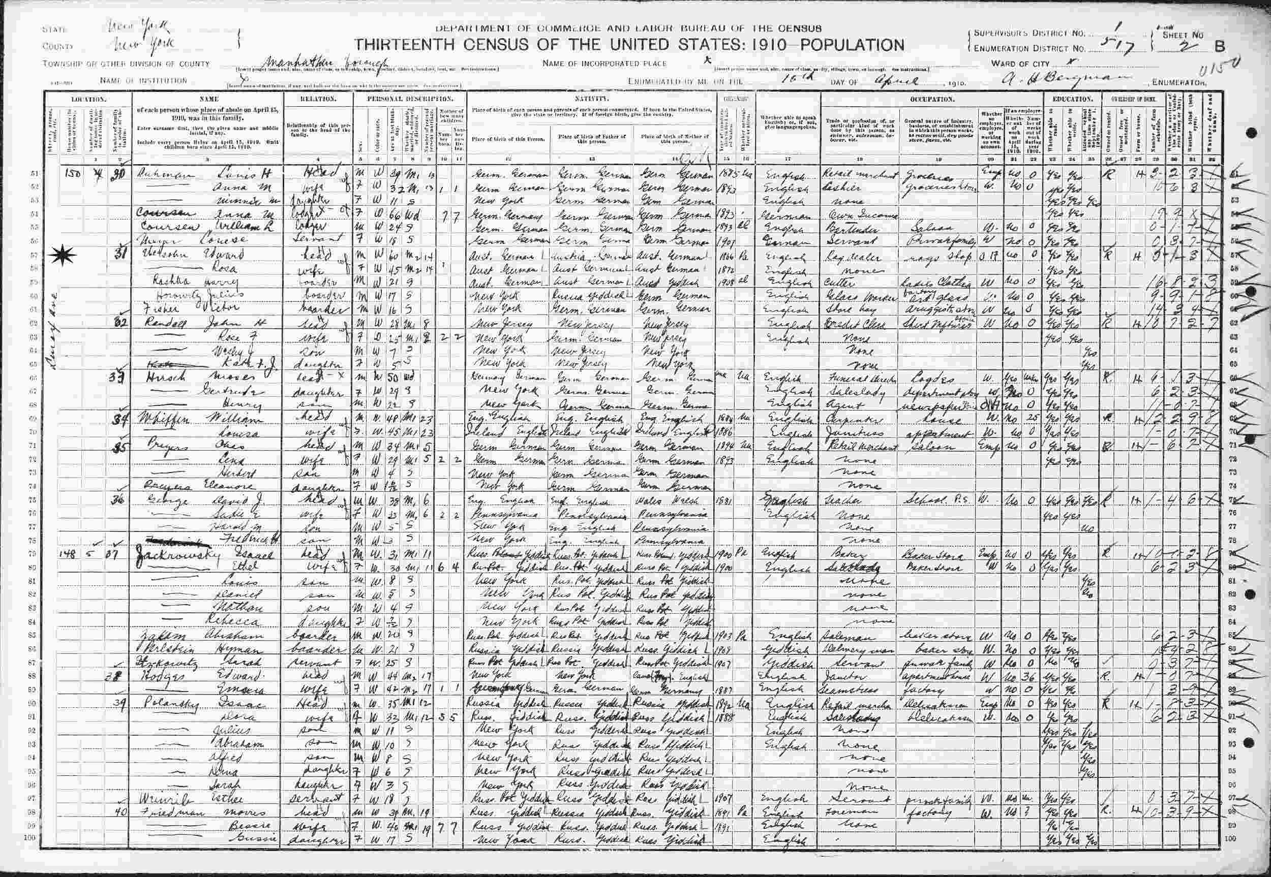April 15, 1910 - 31 Lenox, Supervisor's District 1, Enumeration District 517, Manhattan, New York.