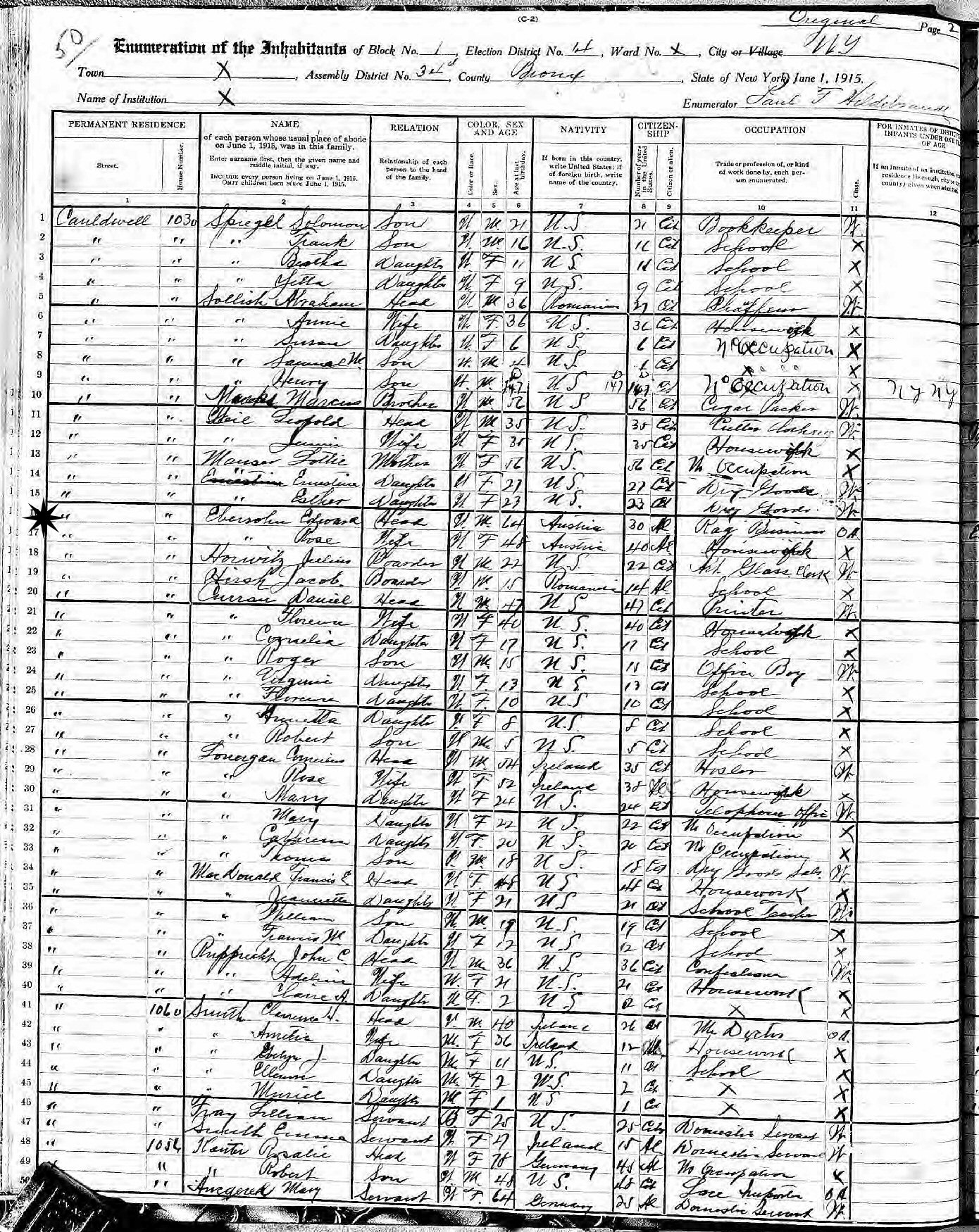 June 1, 1915 - New York State - 1030 Cauldwell, Block 1, Election District 4, Assembly District 34, Bronx, New York.