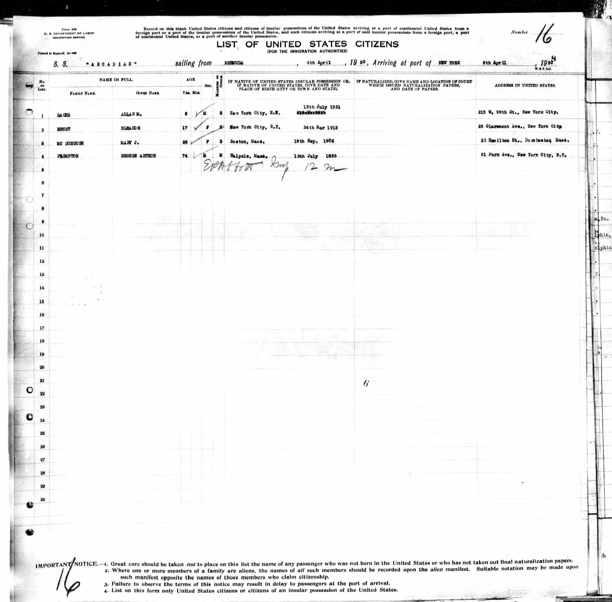 April 8, 1930 - Bermuda to New York City, New York. Ship: Arcadian.