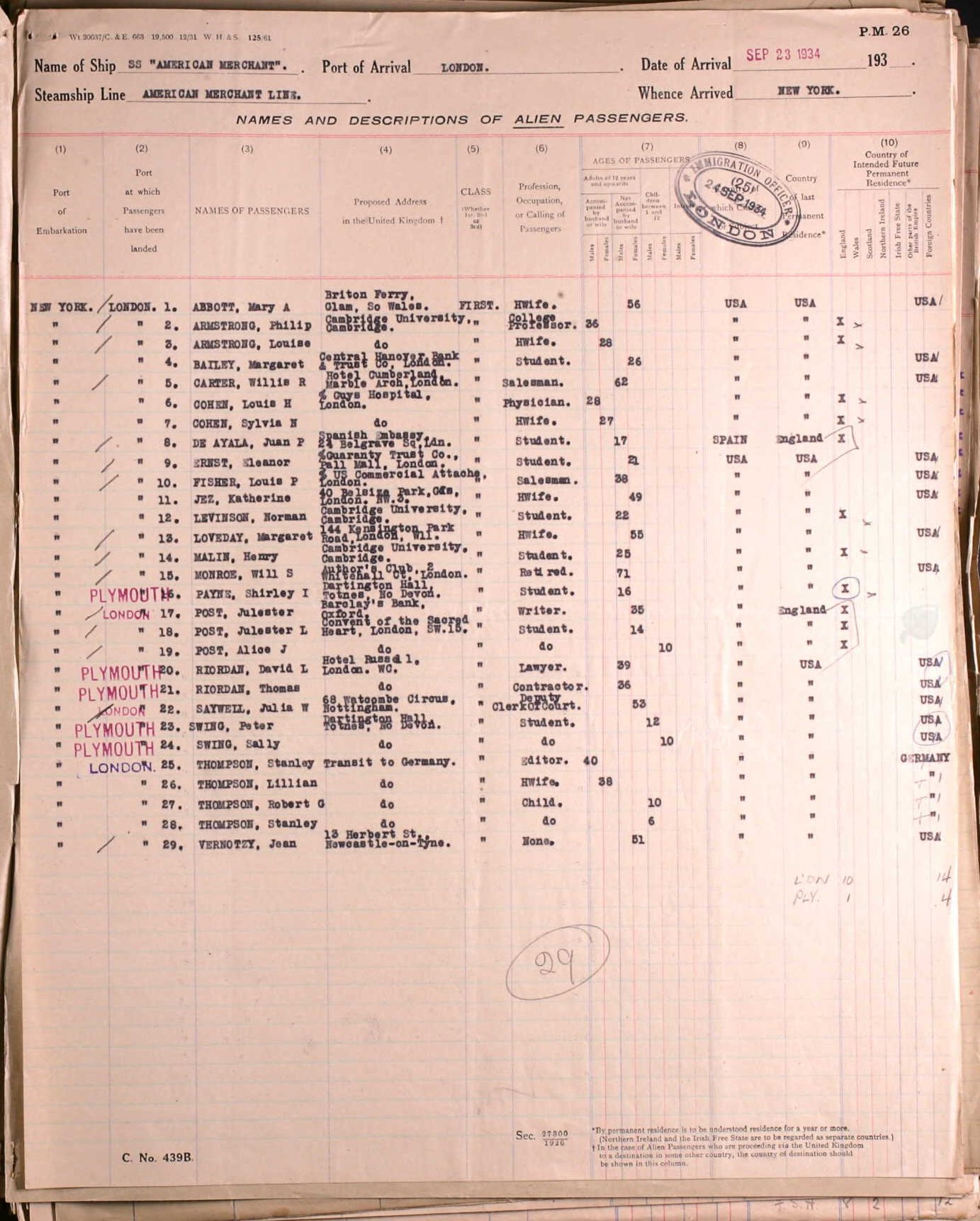 September 23, 1934 - New York City, New York to London, England. Ship: Merchant American.