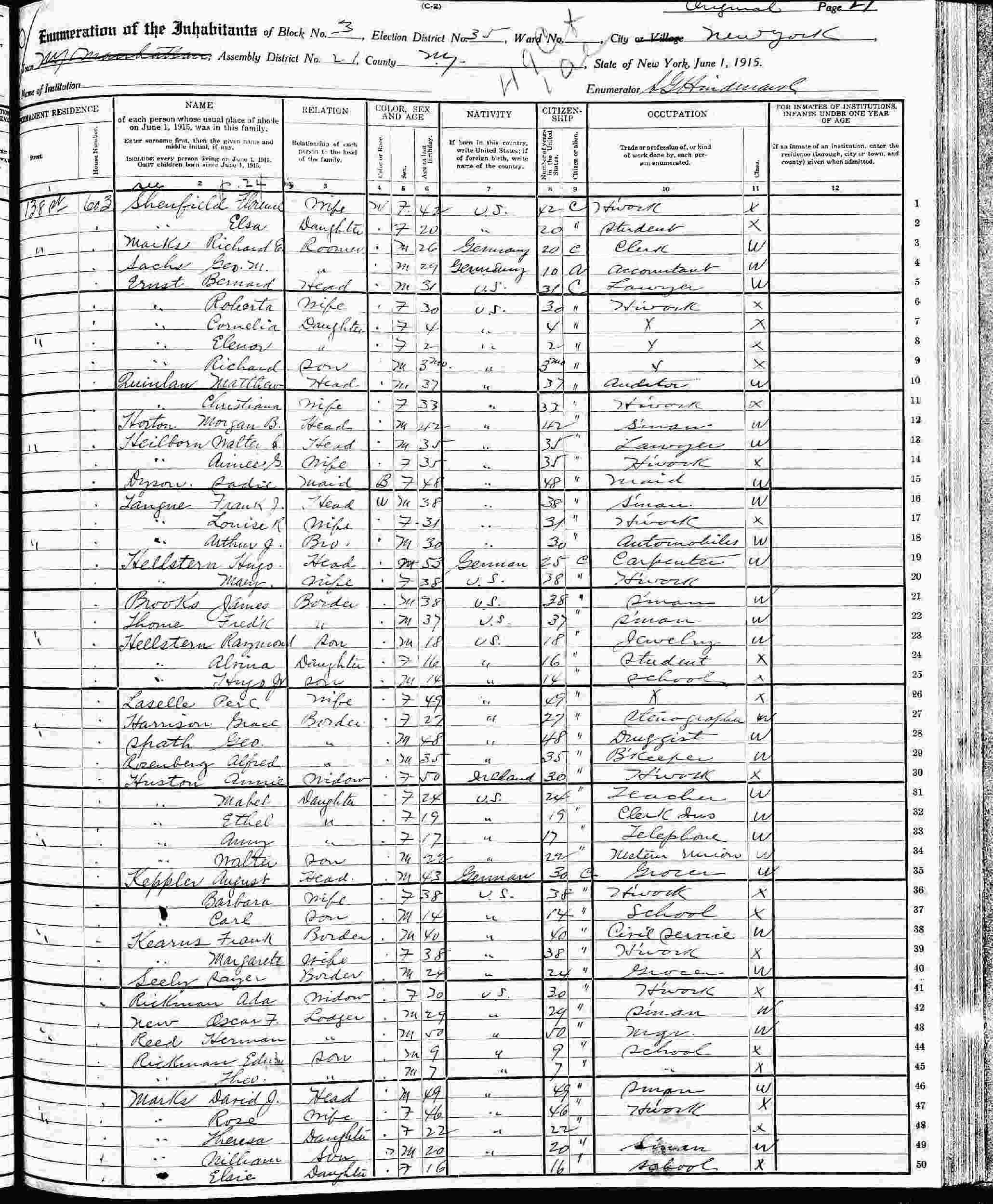 June 1, 1915 - New York State - 603 138th Street, Block 3, Assembly District 21, Election District 25, New York City, New York.
