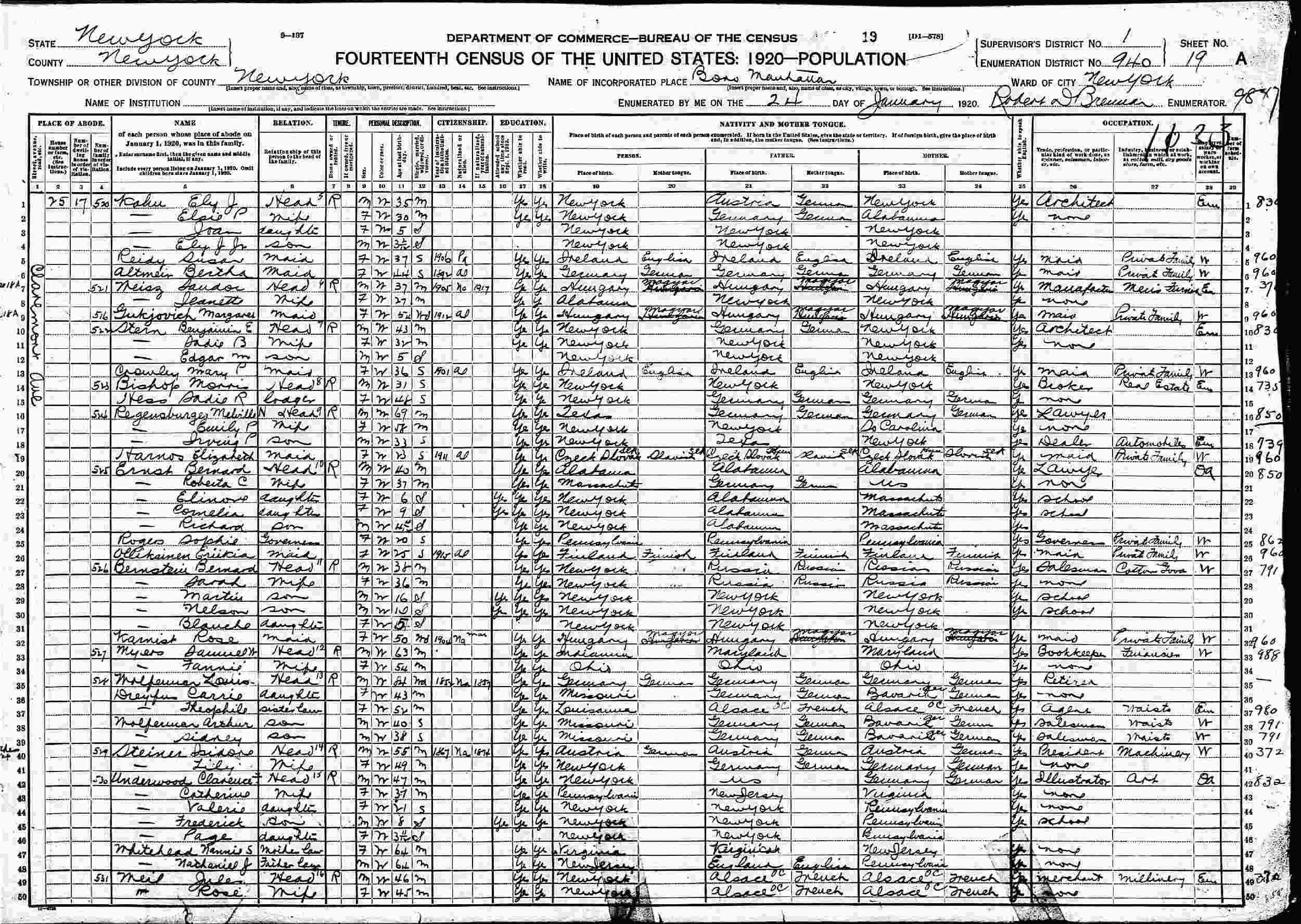 January 24, 1920 - 25 Claremont Avenue, Supervisor's District 1, Enumeration District 940, Manhattan, New York.