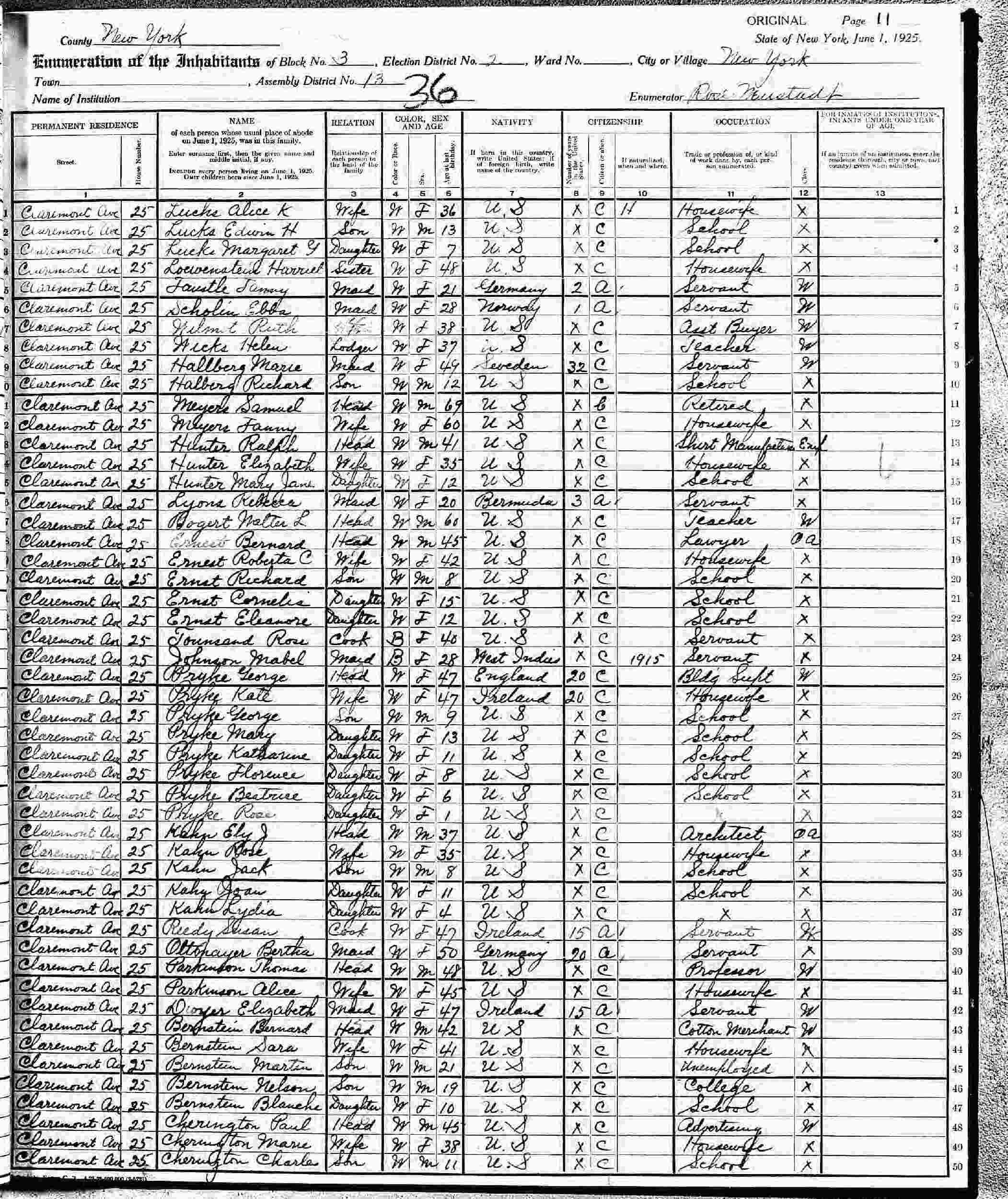 June 1, 1925 - New York State - 25 Claremont Avenue, Block 3, Assembly District 13, Election District 2, New York City, New York.