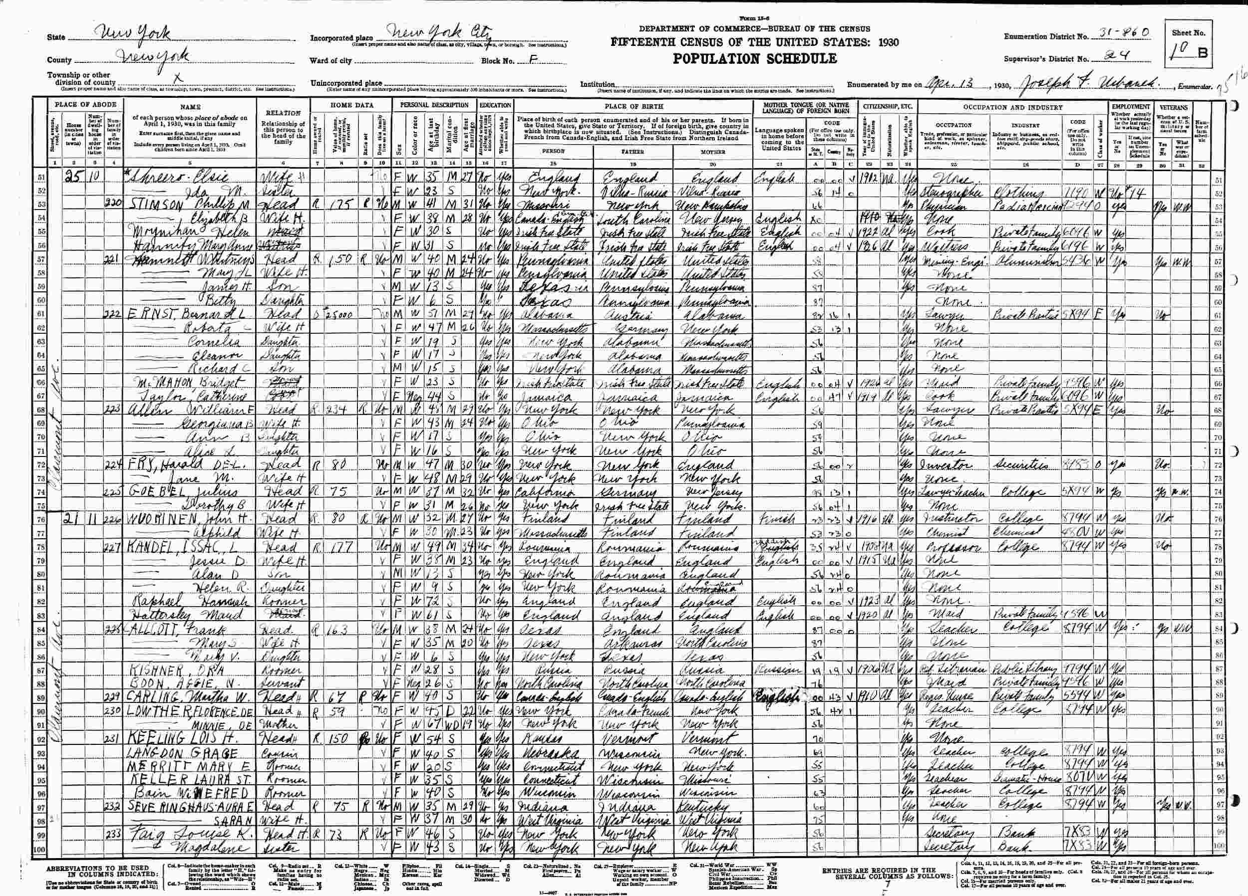 April 13, 1930 - 25 Claremont Avenue, Block F, Supervisor's District 24, Enumeration District 31-860, New York City, New York.