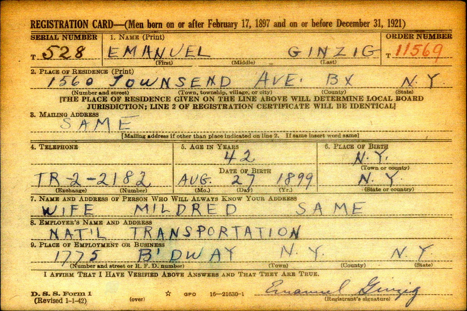 February 15, 1942 - WWII Draft Registration Date; Bronx, New York.