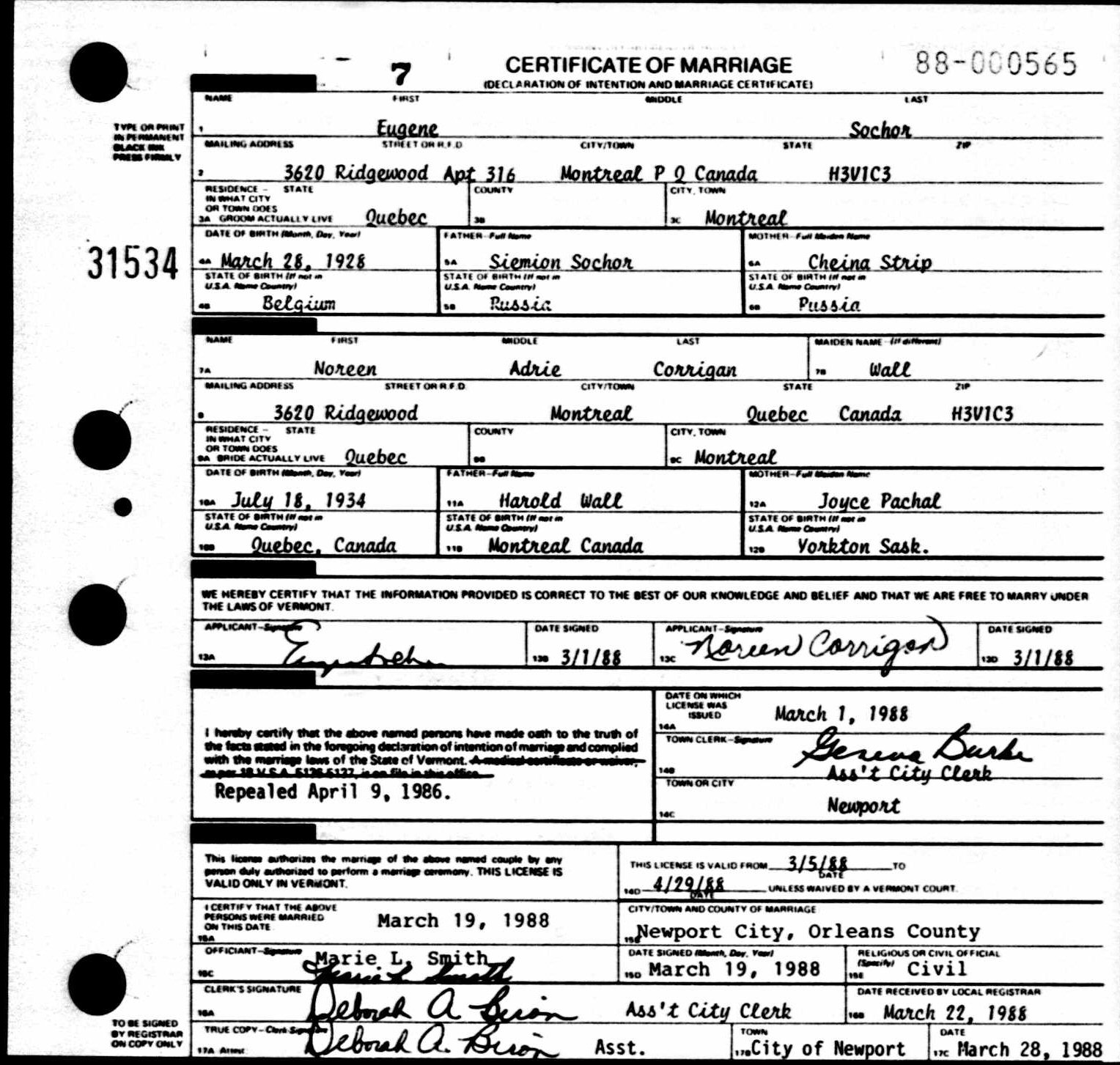 (2) Noreen Adrie Corrigan March 19, 1988 in Newport, Orleans County, Vermont.