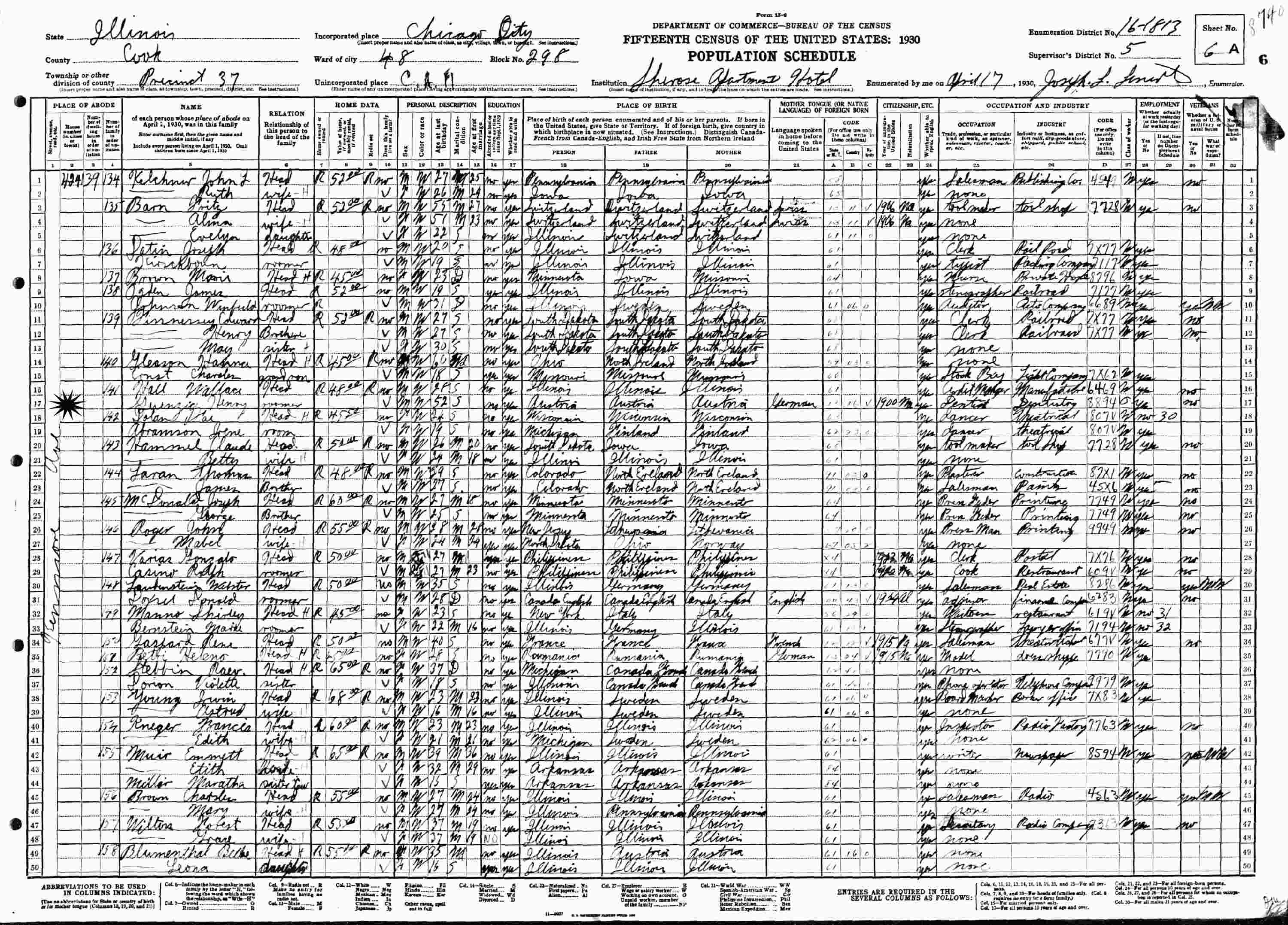 April 17, 1930 - 4241 Kenmore Ave, Sherose Apartment & Hotel, 37 Precinct, 48 Ward, Block 298, Chicago, Cook County, Illinois (roomer).