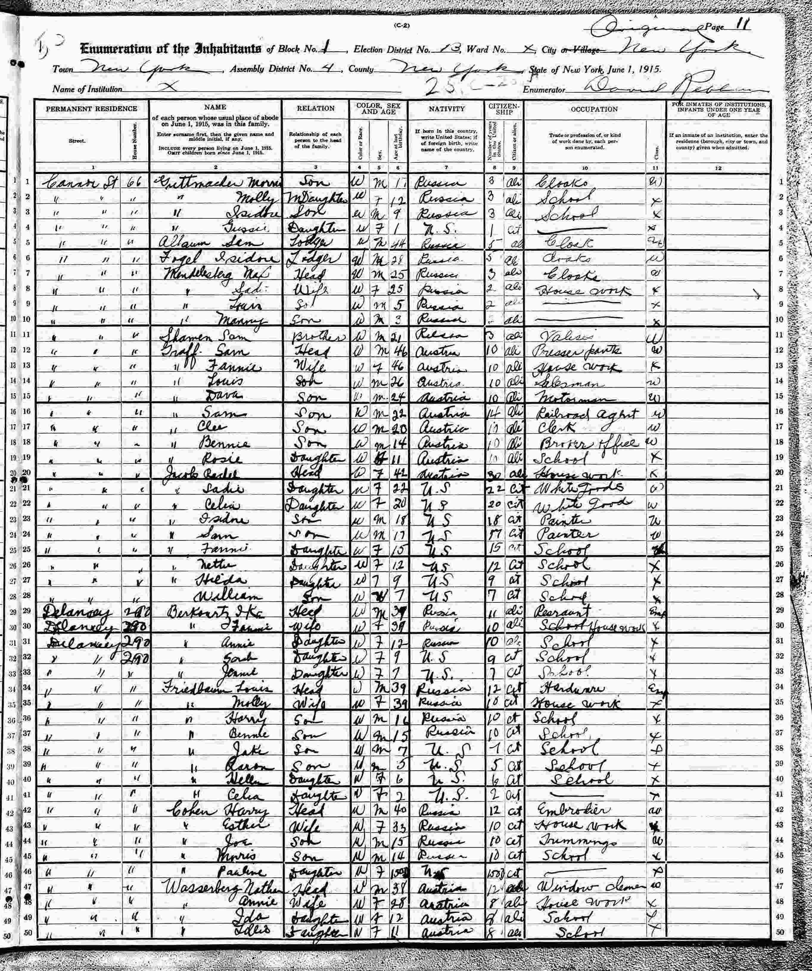 June 1, 1915 - New York State - 290 Delaney Street, Block 1, Assembly District 4, Election District 13, New York City, New York.