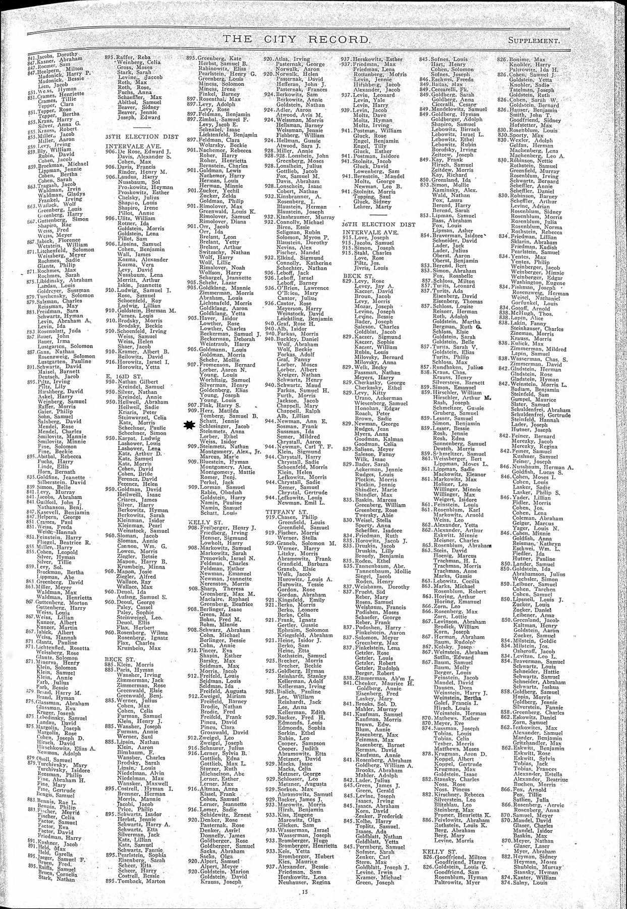 June 1, 1915 - New York State - 909 Beck Street, Block 1, Assembly District 32, Election District 39, Bronx, New York.