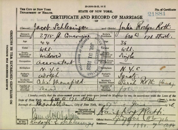 (2) Julia Roslyn Roth June 17, 1926 in Manhattan, New York. (Marriage Certificate: #21881. Marriage License June 3, 1926; Manhattan, New York; #14779.)
