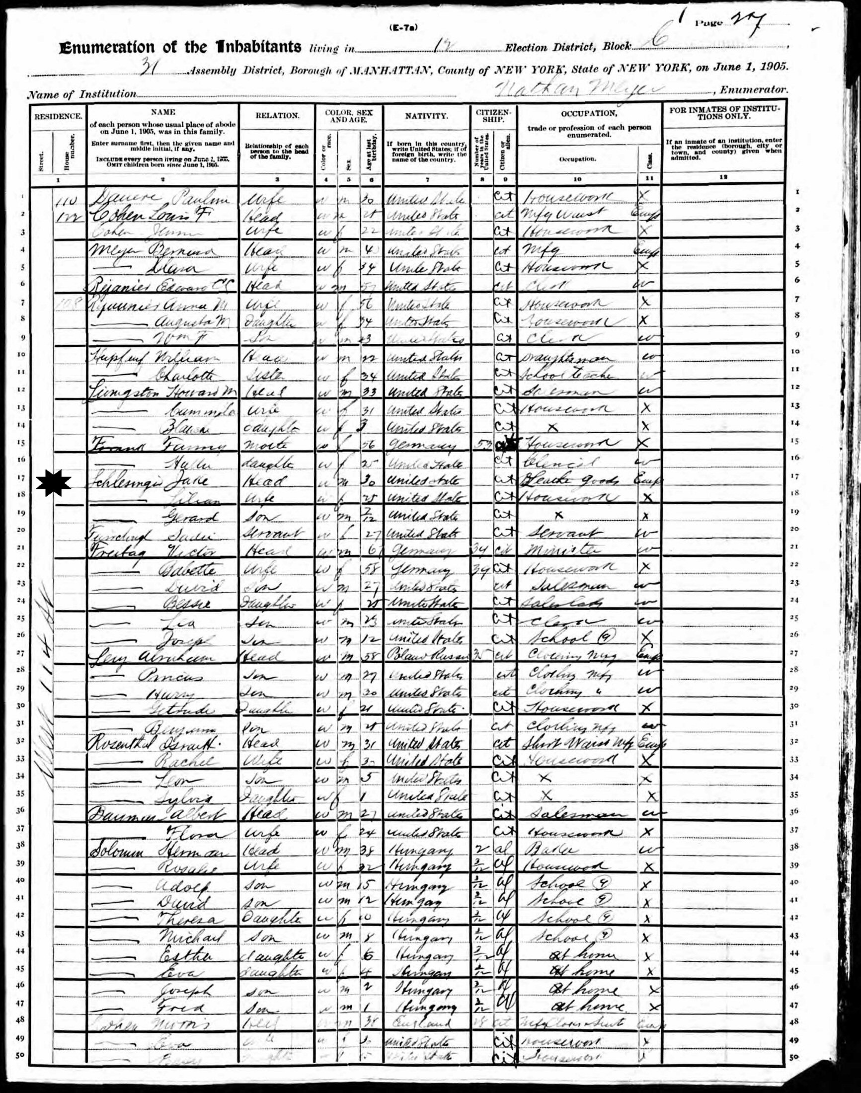 June 1, 1905 - New York State - 108 W 114th Street, Assembly District 31, Election District 12, Block 6, Manhattan, New York.