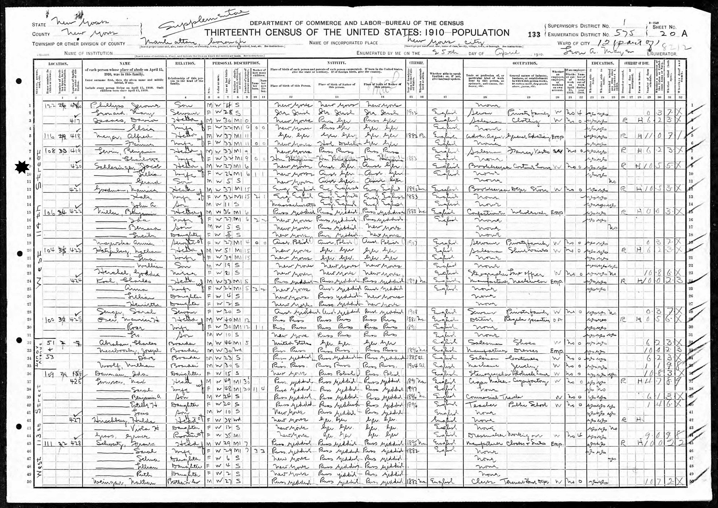 April 25, 1910 - 108 W 114th Street, Supervisor's District 1, Enumeration District 575, Assembly District 12, Manhattan, New York.