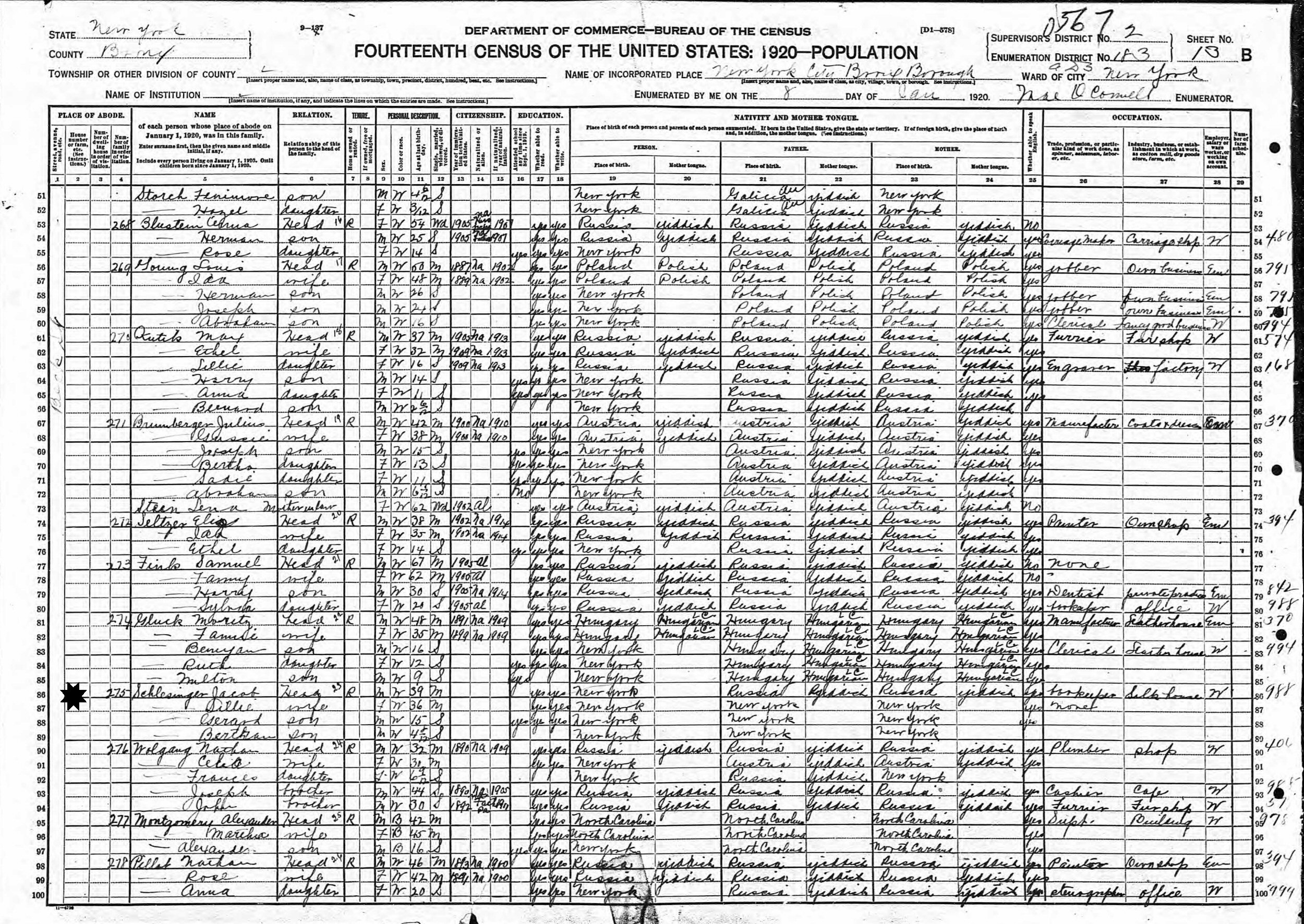 January 8, 1920 - Beck Street, Supervisor's District 2, Enumeration District 183, Assembly District 3, Bronx, New York.