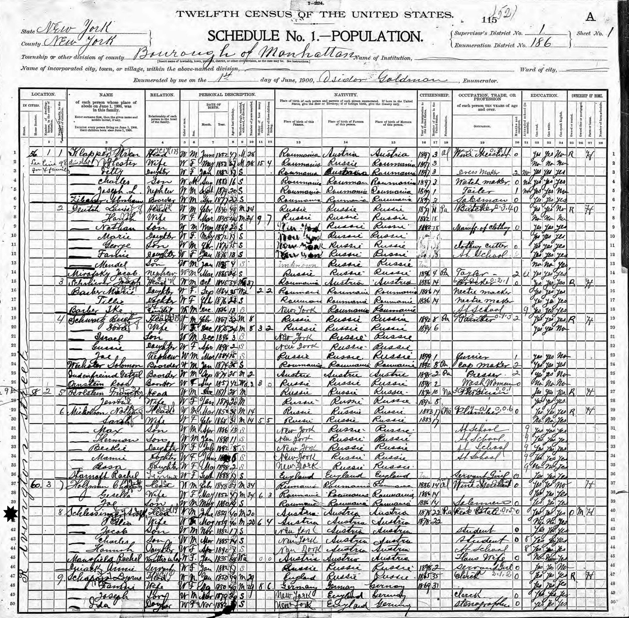 June 1, 1900 - 60 Rivington Street, Supervisor's District 1, Enumeration District 186, Manhattan, New York.
