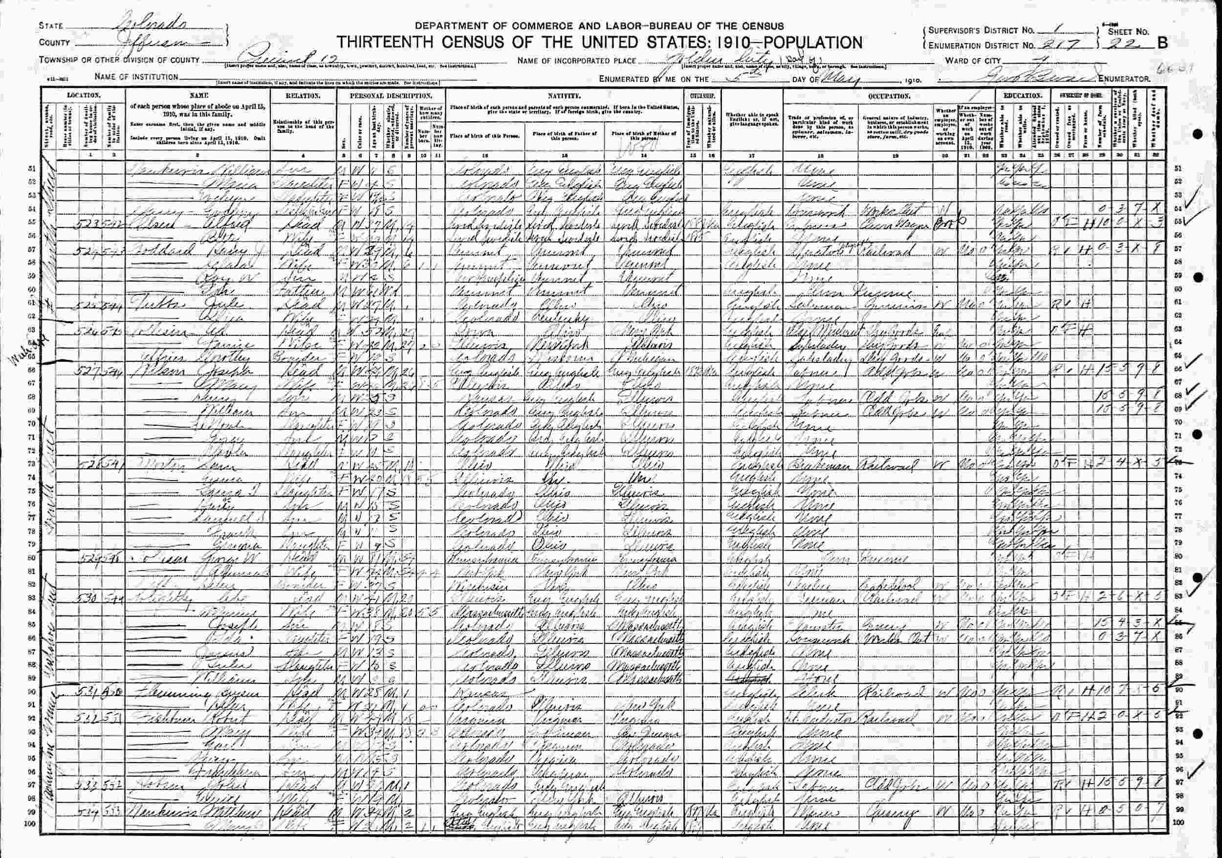 May 5, 1910 - Washington Avenue, Precinct 12, Ward 4, Supervisor's 1, Enumeration District 217, Golden, Jefferson County, Colorado.
