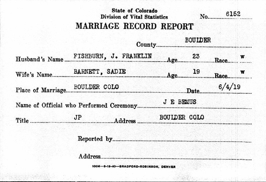 Married: Sadie Catherine Barnett June 4, 1919 in Boulder, Boulder County, Colorado.