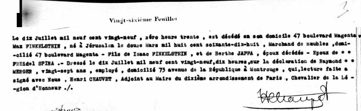 Notes for MAX FINKELSTEIN: Son of Isaac and Berthe (Jaffa) Finkelstein. Born: March 12, 1878 in Jerusalem, Israel. Died: July 10, 1929 in Dixieme Arrondissemnt De Paris, France. Married: Freidel Spira October 23, 1907 in Paris, France.
