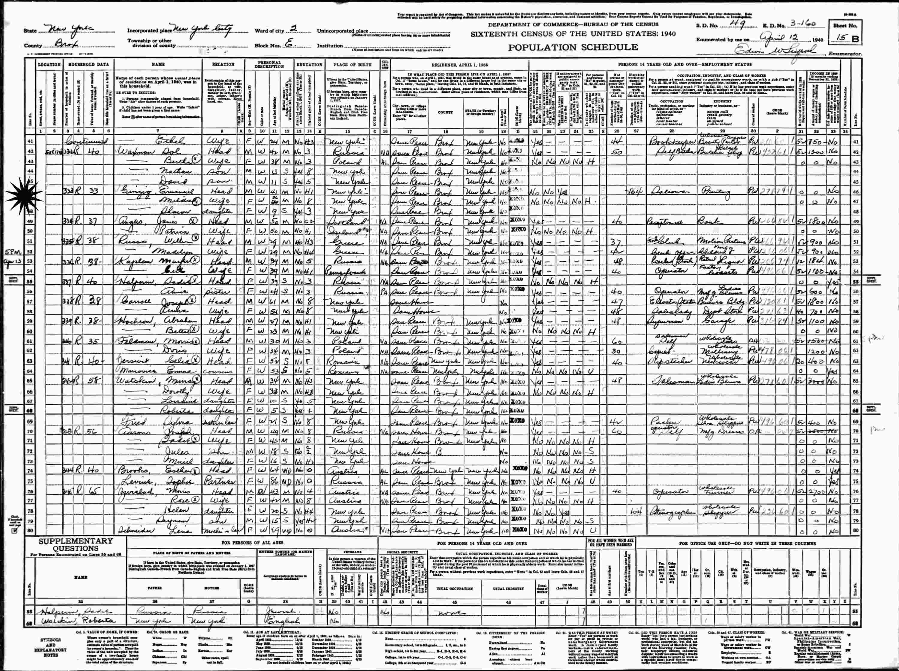 April 12, 1940 - Ward 2, Block E, Supervisor's District 49, Enumeration District 3-160, Bronx, New York County, New York.