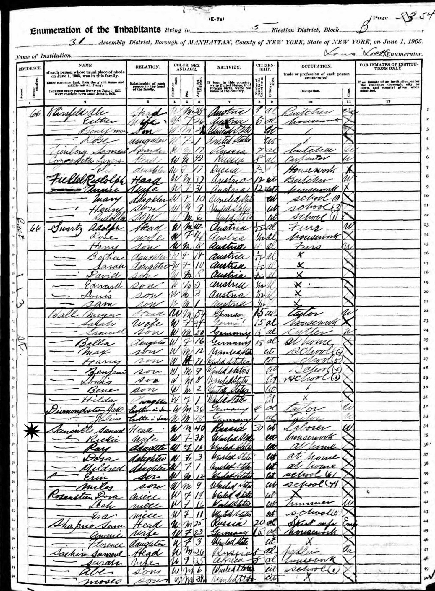 June 1, 1905 - New York State - 66 East 113 Street, Assembly District 31, Election District 5, Block B, Manhattan, New York.