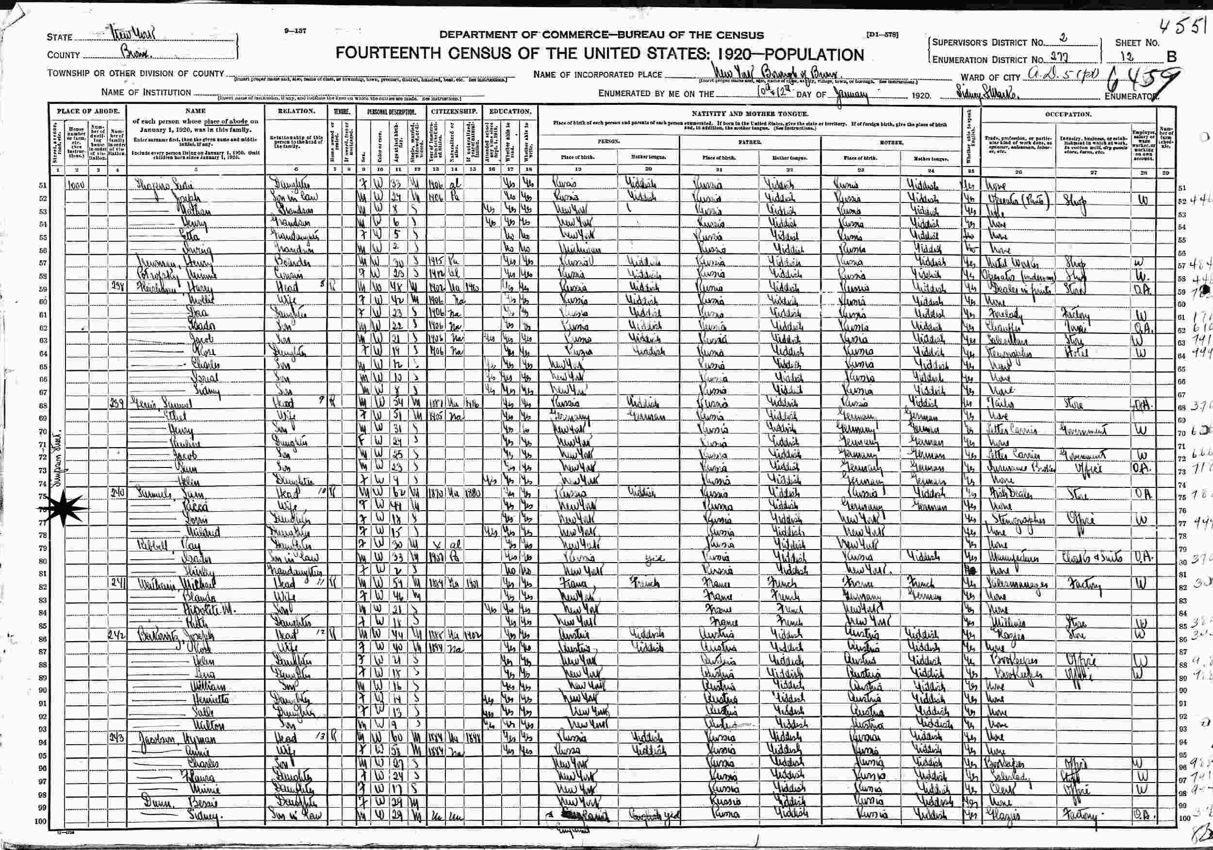 January 10-12, 1920 - Simpson Street, Assembly District 5, Supervisor's Distrct 2, Enumeration District 277, Bronx, New York.