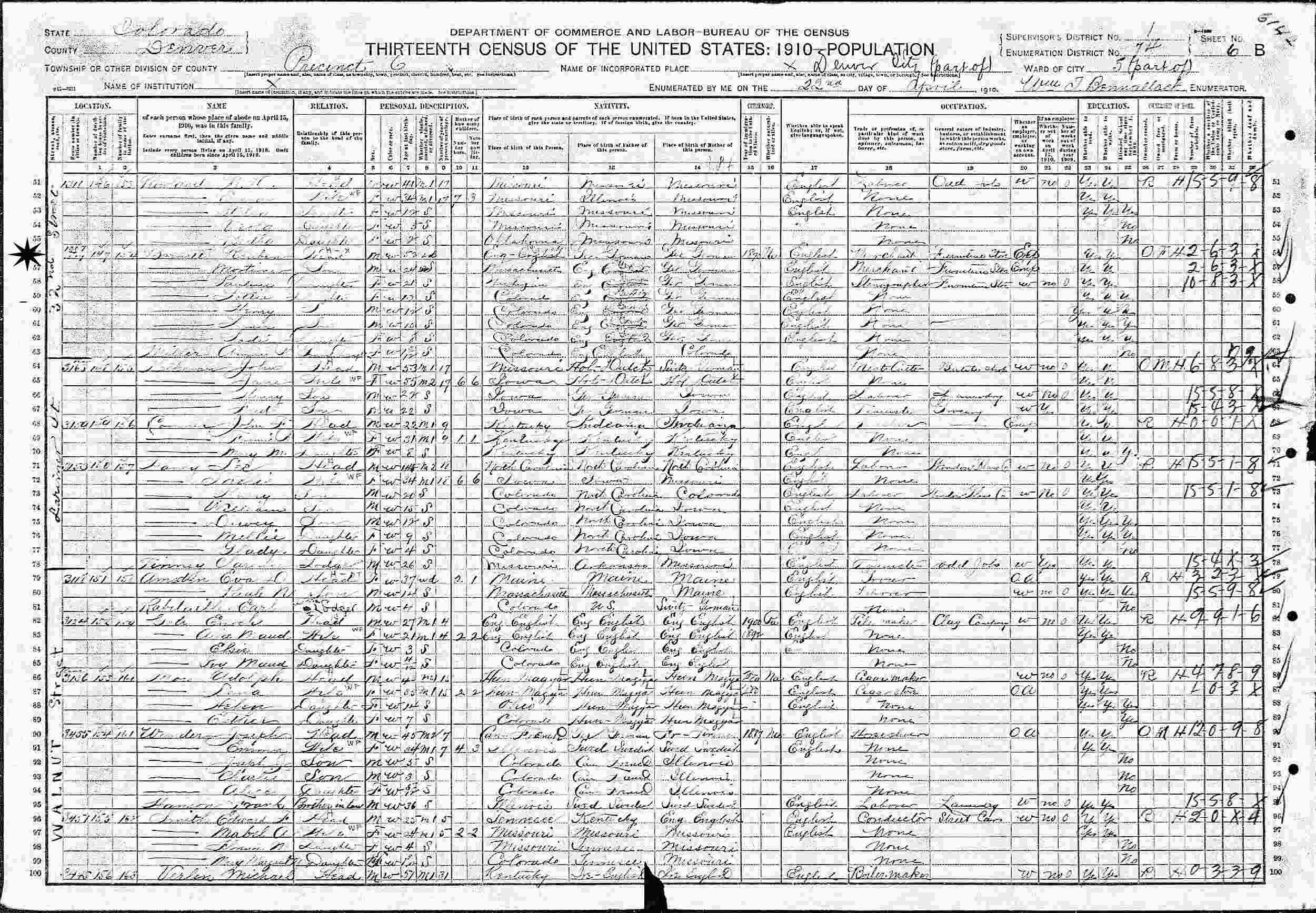 April 22, 1910 - 1307 32nd Street, Ward 5, Precinct 6, Supervisor's District 1, Enumeration District 74, Denver, Denver County, Colorado.