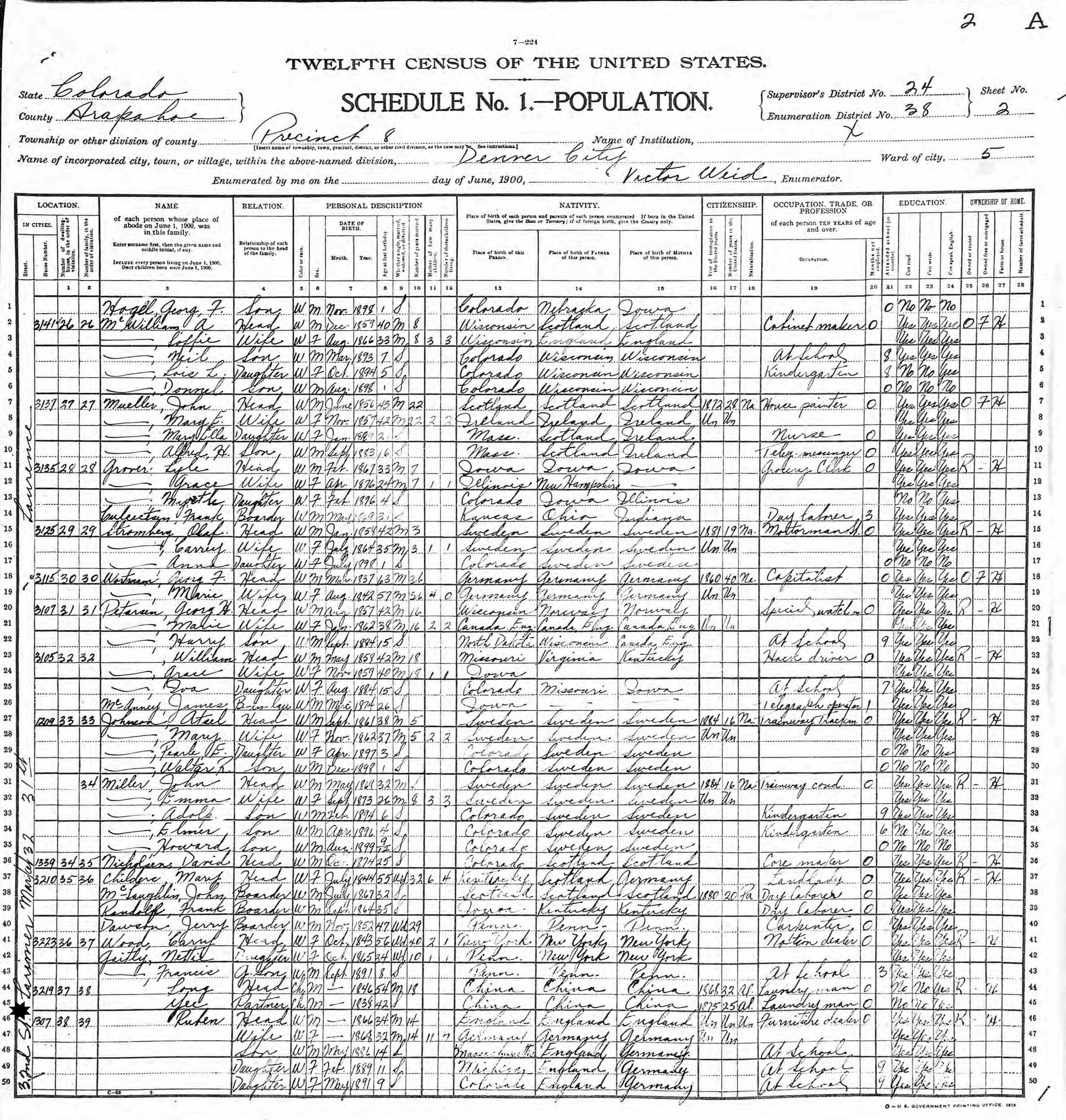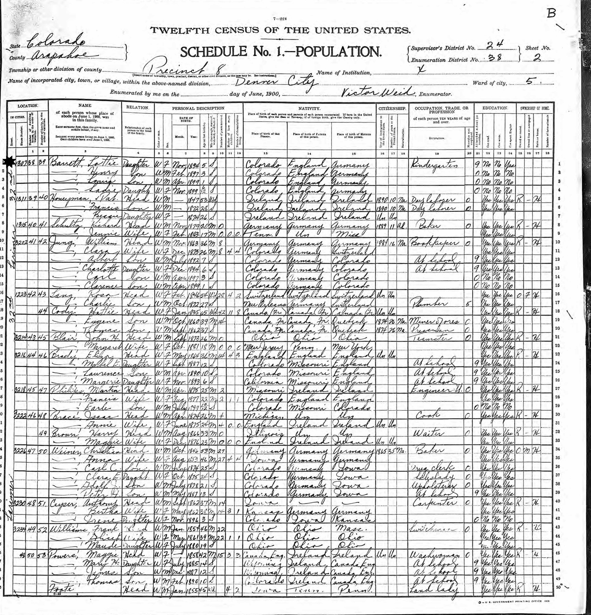 June, 1900 - 1307 32nd Street, Precinct 8, Supervisor's District 24, Enumeration District 38, Ward 5, Denver, Arapahoe County, Colorado.