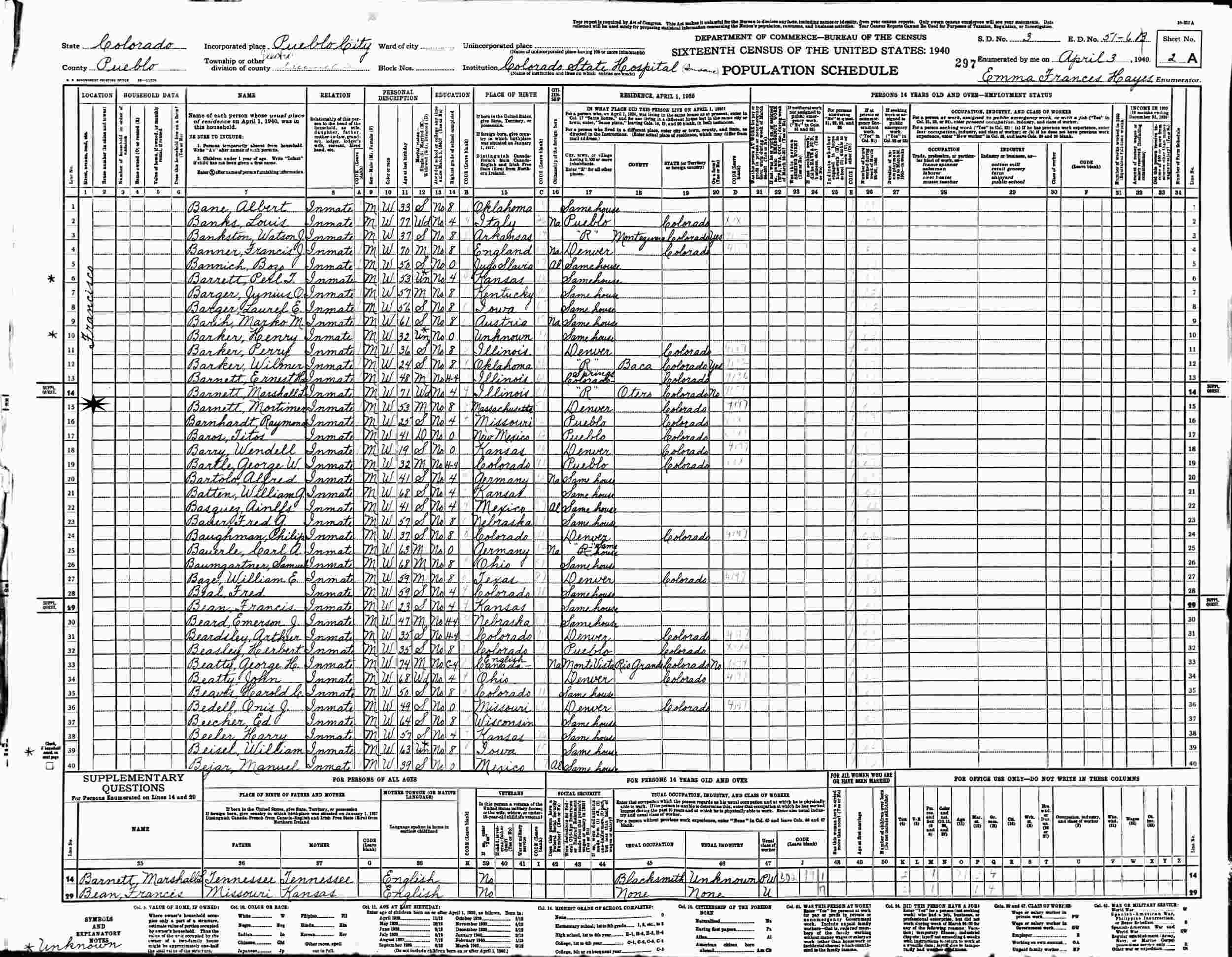 April 3, 1940 - Colorado State Hospital for the Insane, Election Precinct 5, Supervisor's Disrict 3, Enumeration District 51-6B, Pueblo, Pueblo County, Colorado.