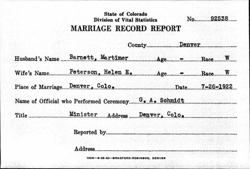 Married: (1) Helen Elizabeth Peterson July 26, 1922 in Denver, Denver County, Colorado. (Marriage License/Certificate: #92538.)