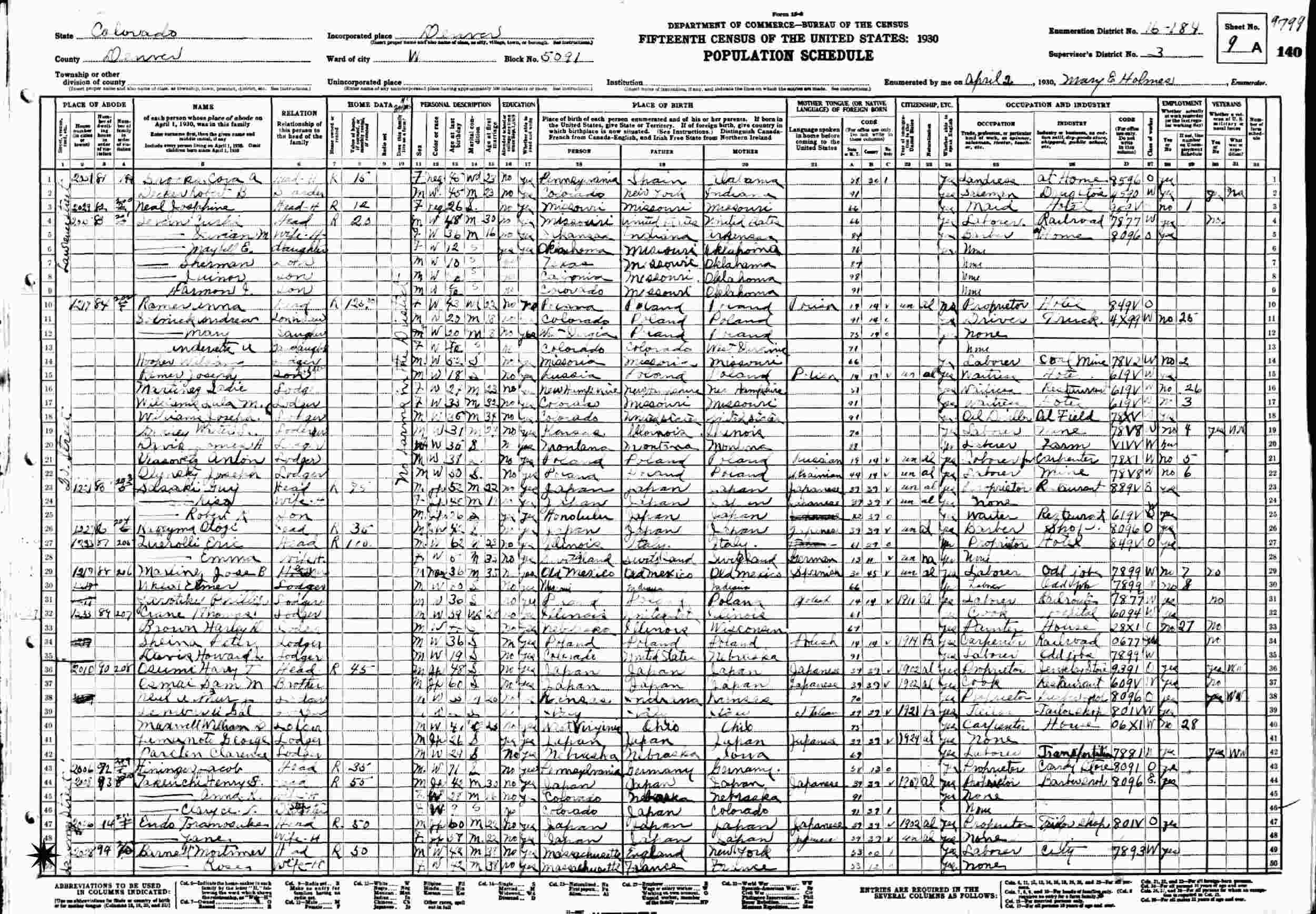 April 2, 1930 - 2028 Larimer Street, Ward W, Supervisor's District 3, Enumeration District 16-184, Denver, Denver County, Colorado.