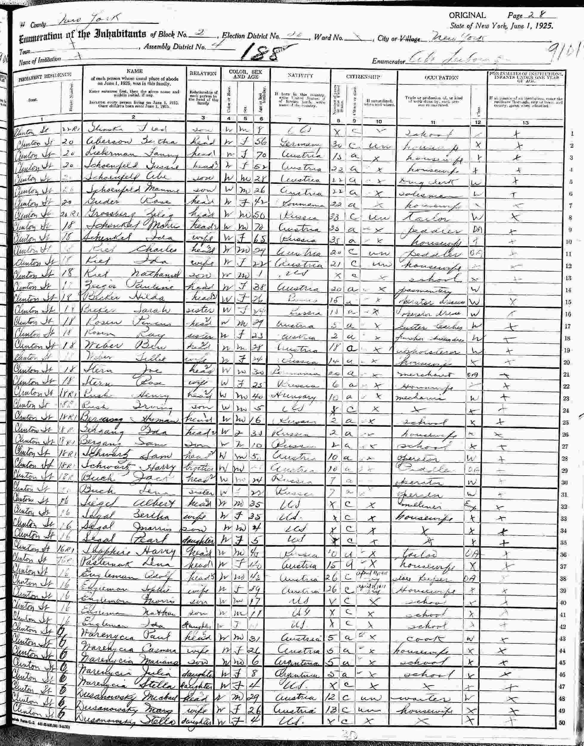 June 1, 1925 - New York State - 18 Clinton Street, Block 2, Assembly District 4, Election District 26, New York City, New York.