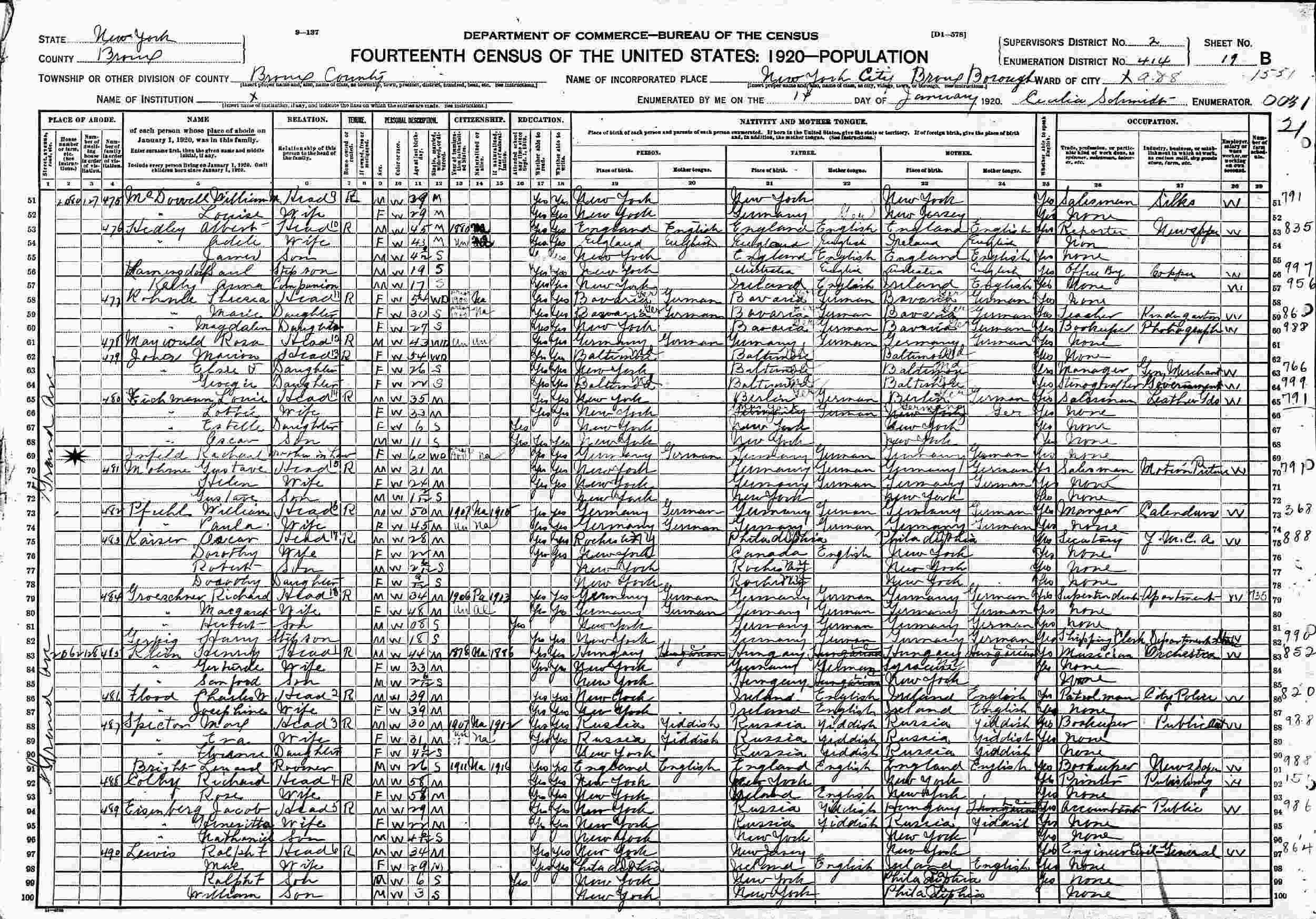 January 14, 1920 - 2080 Grand Avenue, Assembly District 8, Supervisor's 2, Enumeration District 414, Bronx, New York.