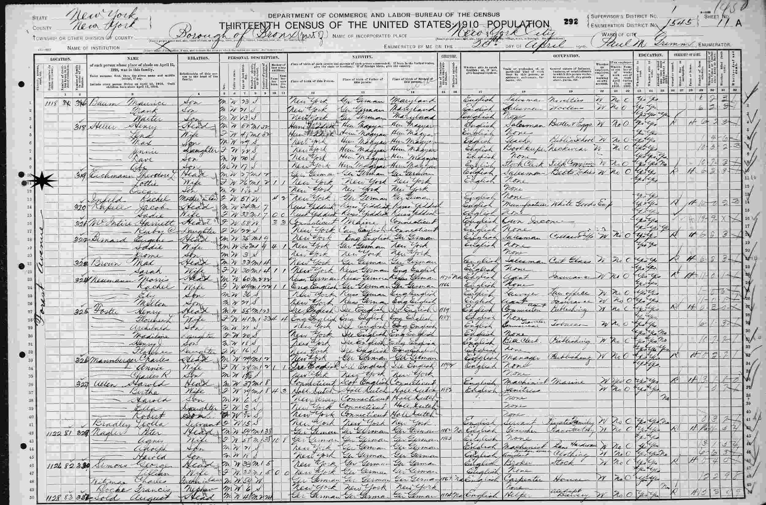 April 20, 1910 - 1118 Forest Avenue, Supervisor's District 1, Enumeration District 1545, Bronx, New York.