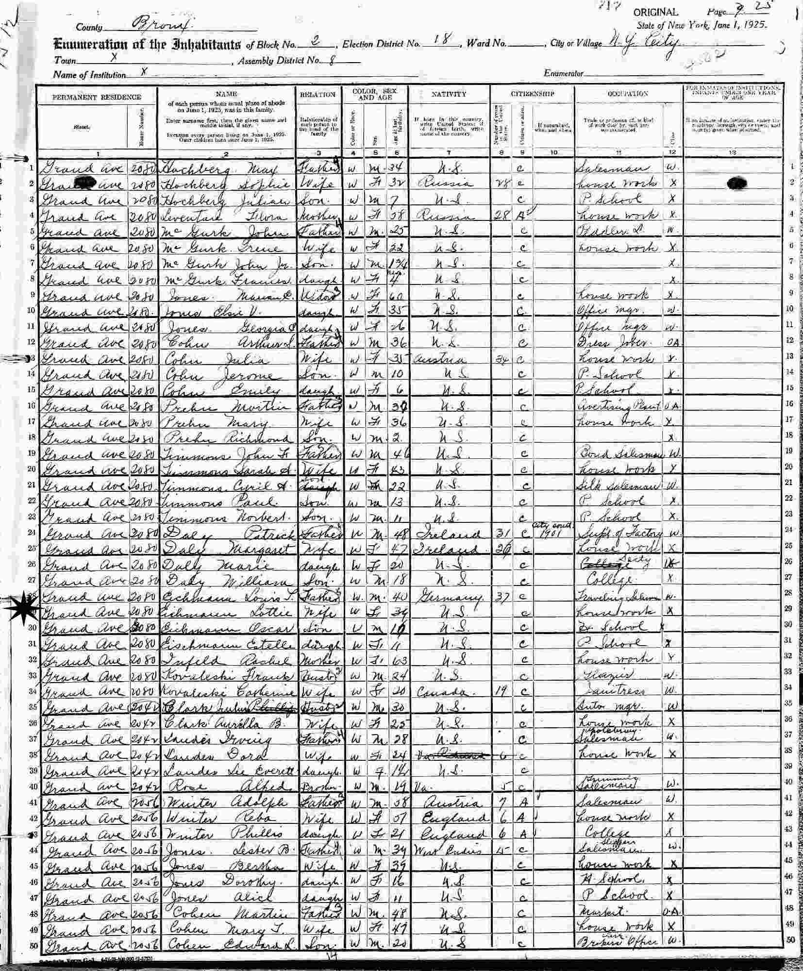 June 1, 1925 - New York State - 2080 Grand Avenue, Assembly District 8, Block 2, Election 18, Bronx, New York.