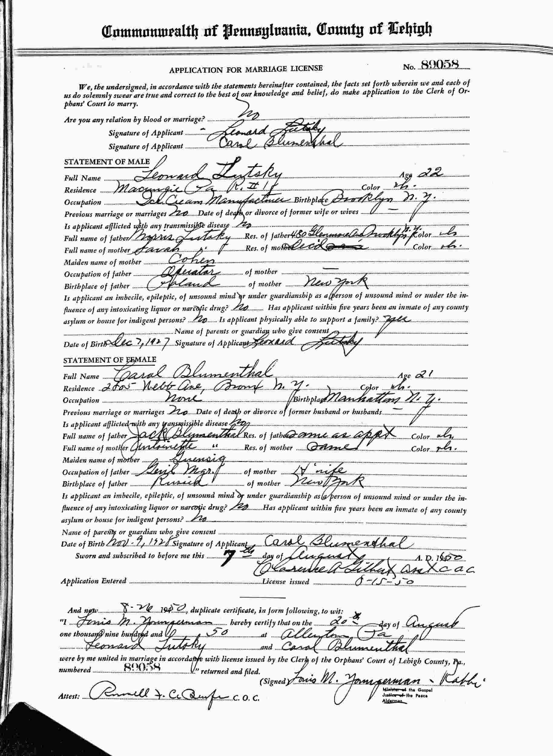 Married: Leonard Lutsky August 26, 1950 in Allentown, Lehigh County, Pennsylvania. (Marriage License: August 7, 1950; #89058).