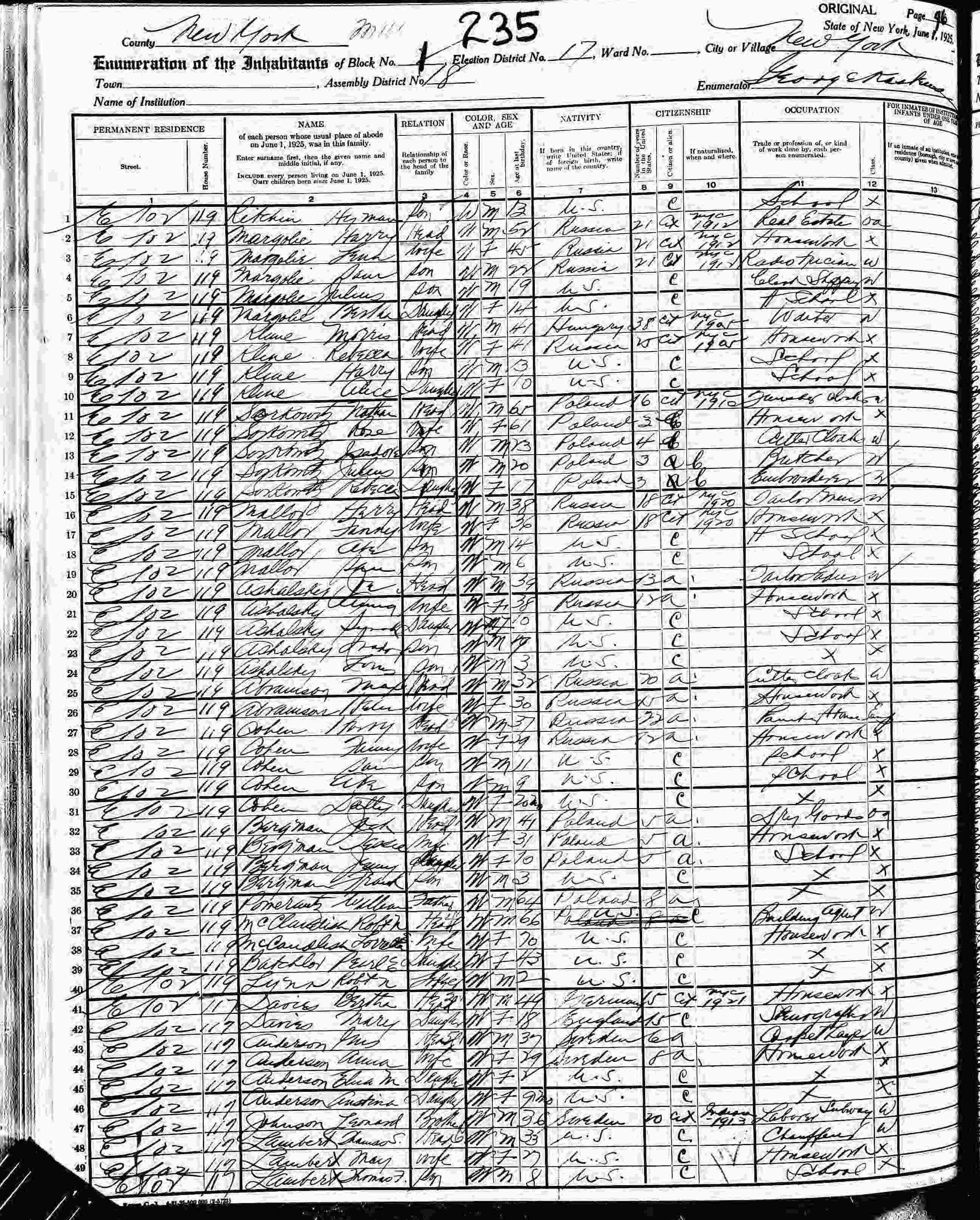 June 1, 1925 - New York State - 119 E 102nd, Block 1, Election District 17, Assembly District 18, New York City, New York.