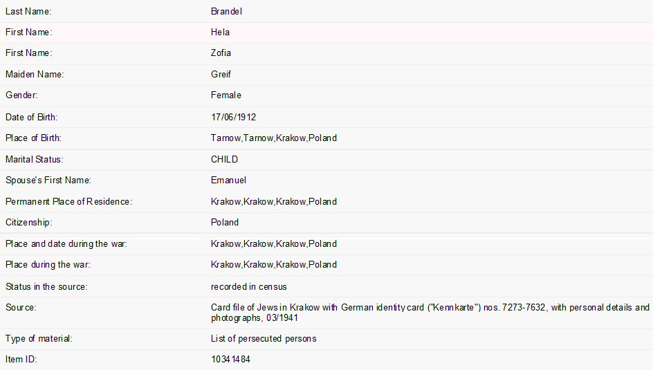 Notes for HELA ZOFIA GREIF BRANDEL: Daughter of Maksymilian "Max" and Antonia (Szancer) Greif. Born: June 17, 1912 in Tarnow, Poland. Died: After March, 1941 in Shoah. Married: Emanuel Brandel 1933 in Prog. Syng., Krakow, Poland.