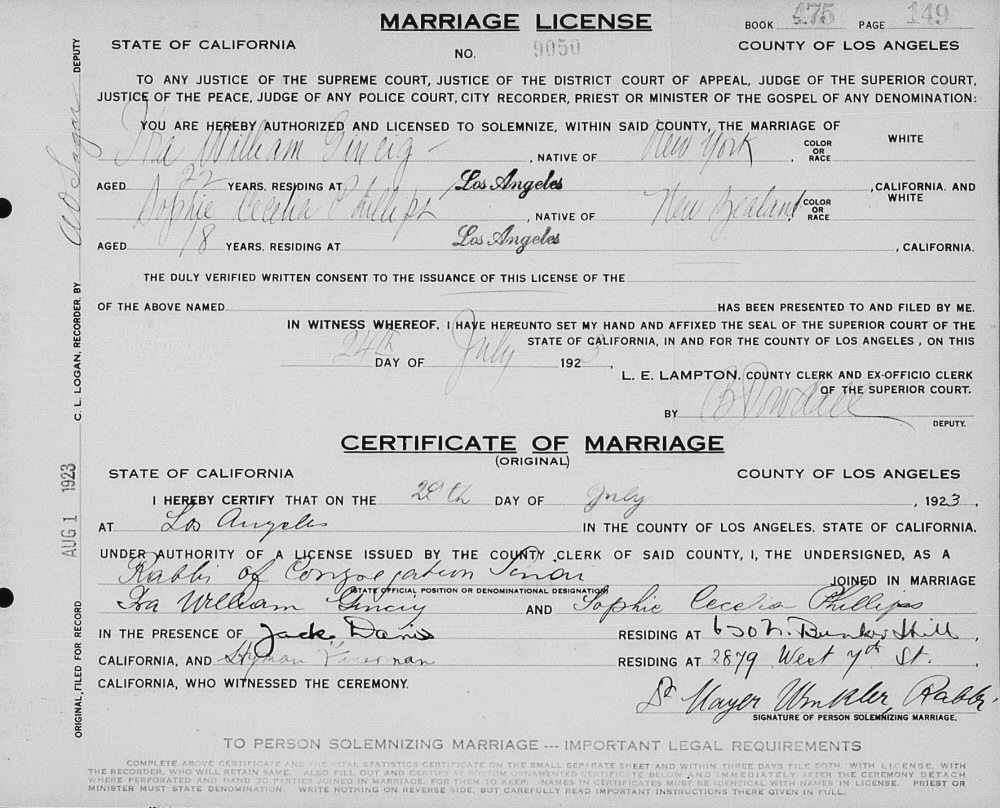 Married: Sophie Cecelia Phillips July 29, 1923 in Los Angeles, Los Angeles County, California. (Divorce: filed Abt Dec 21, 1929 but looks like never divorced)