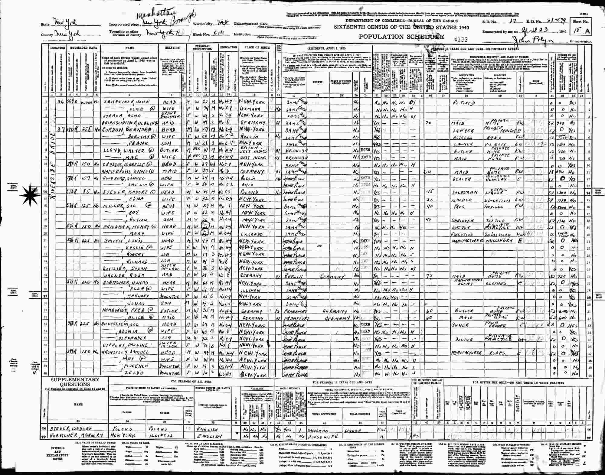 April 23, 1940 - 37 Riverside Drive, Block 6H, Supervisor's District 16, Enumeration District 31-579, Manhattan, New York.