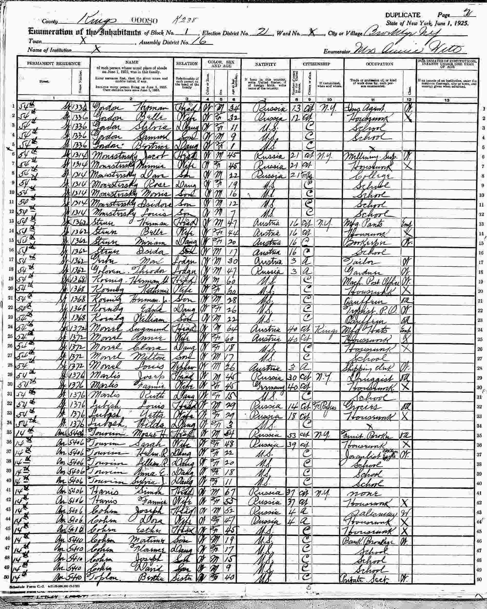 June 1, 1915 - New York State - 132 Brook Avenue, Block 1, Election District 39, Assembly District 30, Brooklyn, Kings County, New York.
