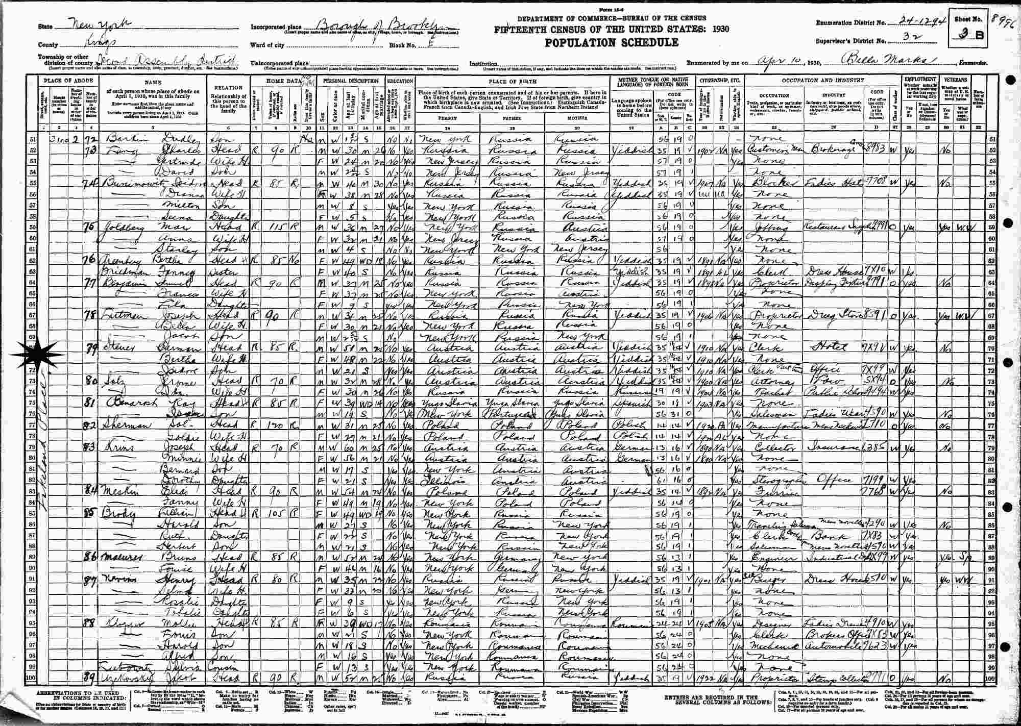 April 10, 1930 - 3100 Lakeland Place, Assembly District 2, Block E, Supervisor's District 32, Enumeration District 24-1294, Brooklyn, Kings County, New York.